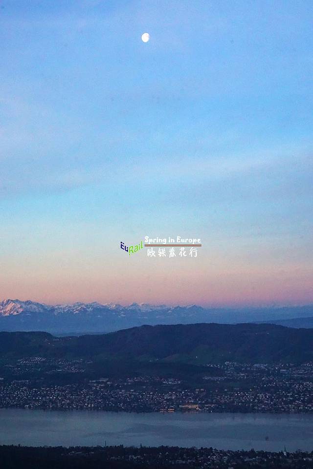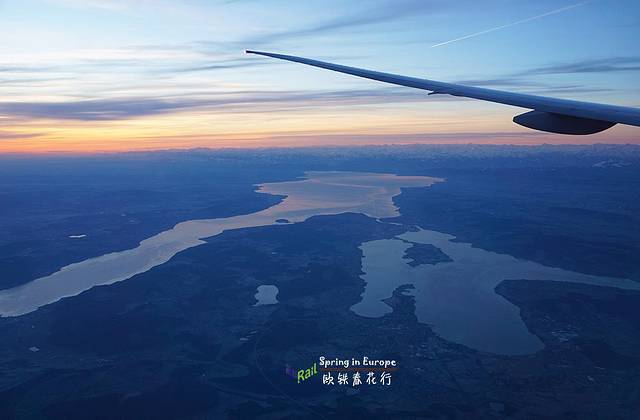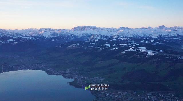 接近苏黎世。飞机在空中飞行的速度追回了晚点起飞的那半个小时,拂晓的苏黎世城还在宁静安睡,远处的雪山绵延屹立,日照雪山顶的暖金色总让我心喜。