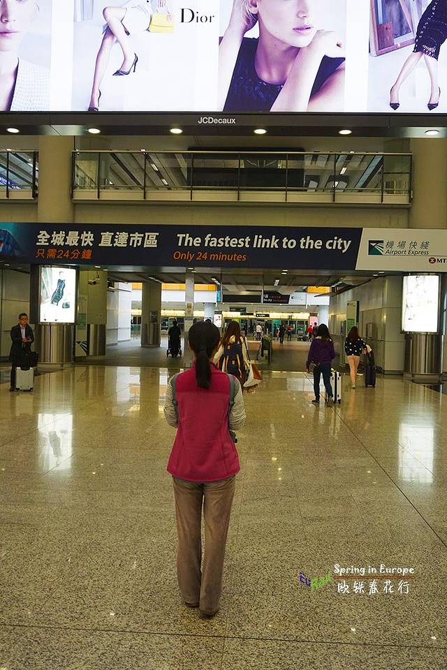购票后向右走,看到上面有“全城最快,直达市区”的广告招贴下面,就是机场快线的车站,一直往前就是,中间还有一段有自动步道的。由于我们购买的机票是联程机票,行李都直挂到了苏黎世,因此在香港机场是轻装出行,没有负担。