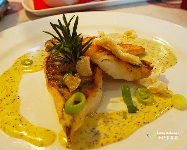 鲈鱼煎制得香嫩可口,酱汁调味也可圈可点。整个晚餐账单36.50欧元。