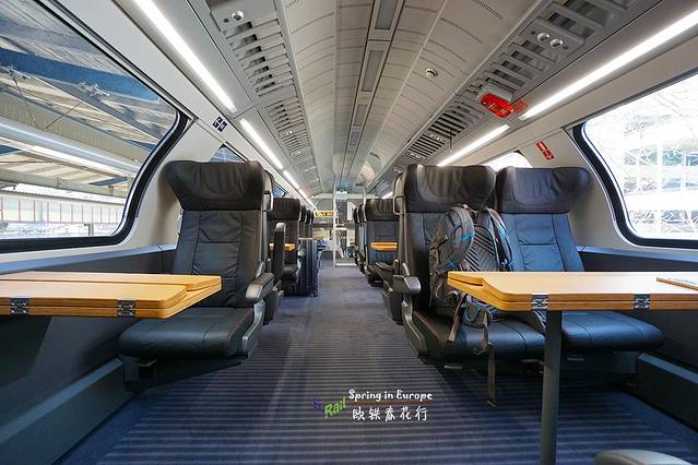 GLOBAL PASS都是一等座,而一等座车厢相当舒适和宽敞,一般一排只有三个沙发座位,过道一边是一个单人座,另外一边是双人座,适合独自旅行和结伴旅行的乘客。由于乘客不多,我们的箱子就不必要放在门口的行李架处,而可以安放在自己跟前的座位旁,这样心理上觉得更加安全。