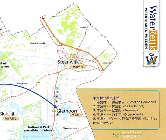 我们从科隆中央火车站出发,一路向北进入荷兰境内,阿纳姆是进入荷兰转车的第一站,而兹沃勒(Zwolle)则是所有要去羊角村的朋友搭乘欧铁必经的转车地,因为只有在这里才有发往斯滕维克(Steenwijk)的火车。两次转车行程三个半小时,我们到Steenwijk火车站下车,从这里转巴士才能到达羊角村。