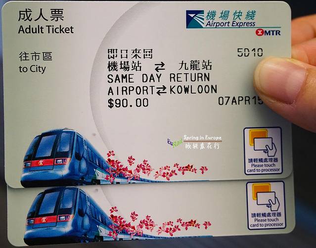 这就是我们购买的即日往返机场站和九龙站之间的机场快线车票,购票时一定要说明是当日往返的,否则单程也是这个价格,你回程要再买票就划不来了!