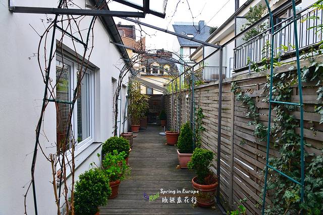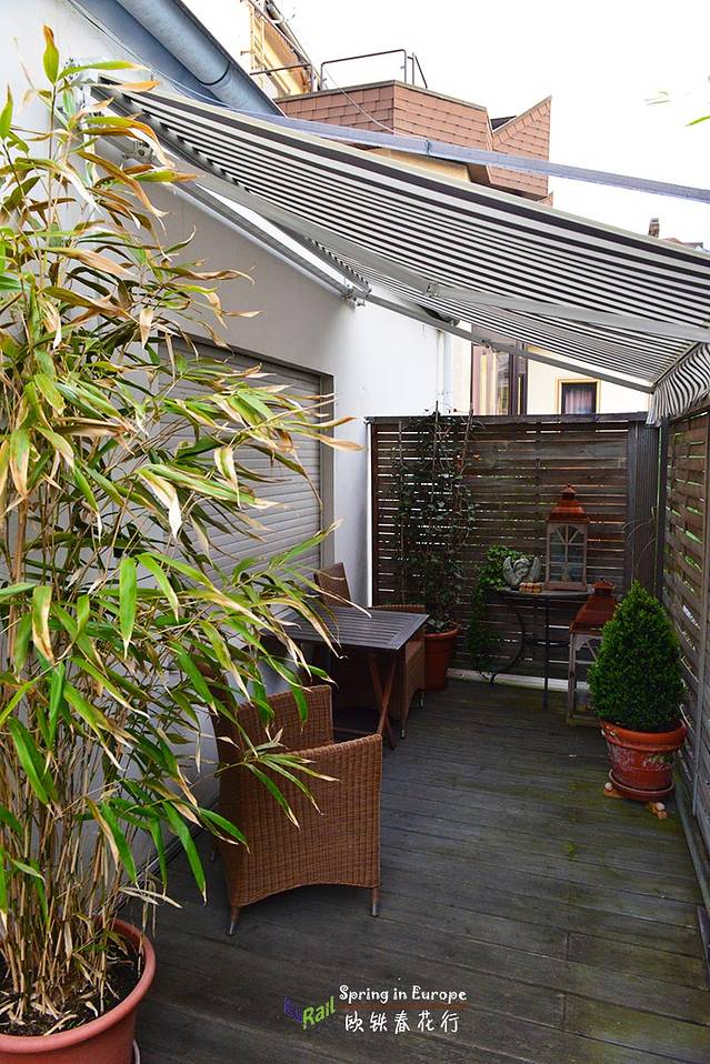 客房的窗外,是一个长条的大面积露台,上面的绿化盆栽都已经郁郁葱葱,显示着春天的到来。露台上还有喝咖啡的桌椅,清晨的空气非常新鲜。