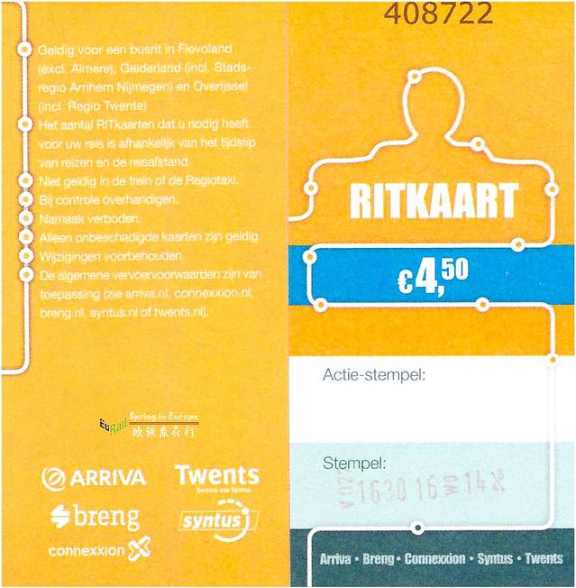 从Steenwijk到羊角村车票价格每人4.50欧,已经涨价不少。上车买票,购票后盖销。由于我们要在羊角村入住两个晚上,就没有问往返车票价格优惠问题。