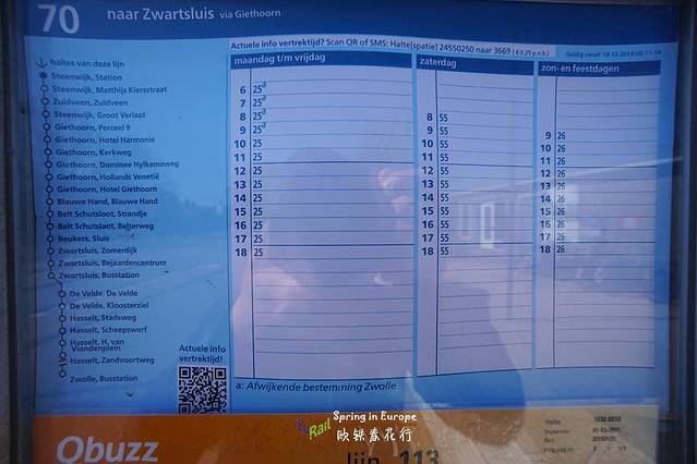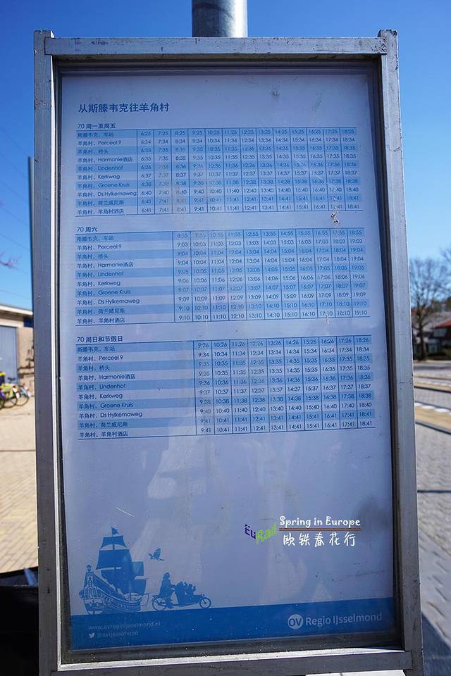 这是从Steenwijk到羊角村的70路公交车发车时刻表,其中周中日子,从早上6点到傍晚6点,每小时的25分有一班巴士发车。我们14:18抵达火车站,顺利搭上14:25的巴士。如果万一火车晚点,相对应的那班大巴也会延迟发车的。