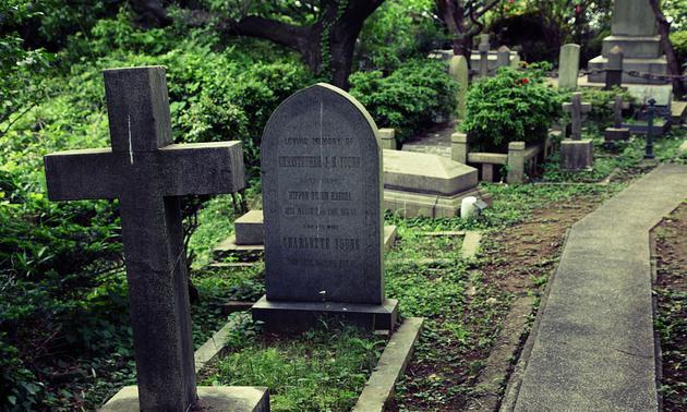 外国人公墓始建于1854年,这里会根据死者的国籍或宗教信仰划分区域。砖围墙内是中国人墓地,对面是俄罗斯人墓地,各种不同宗教信仰的墓地相互为邻,同样面对下面波涛起伏的大,景色肃穆幽静。