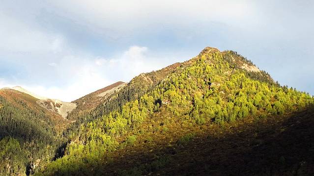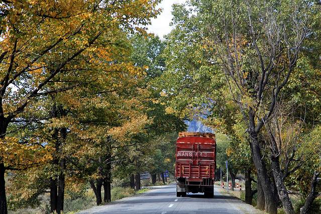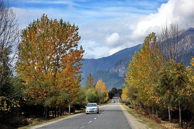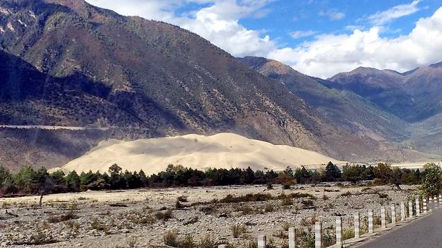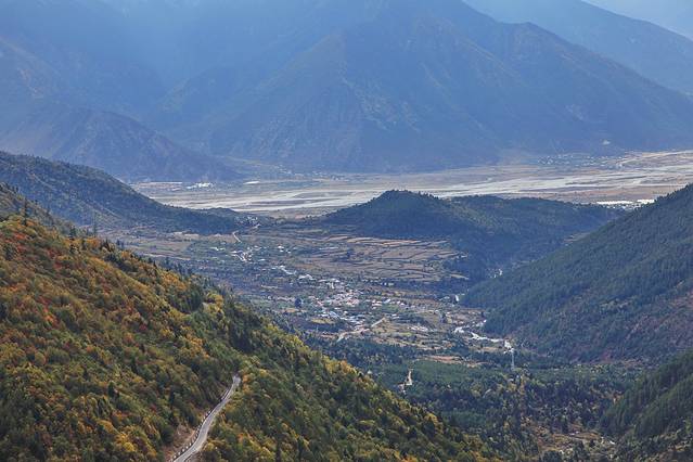 13点20分,我们抵达了工布江达。进入工布后,太阳仿佛滚落在山林与树木间,大片大片明晃晃的色彩冲击着惊艳到无法喘息的眼球,令人目不暇接。我太爱这一片金橘色的热烈了~我们的司机师傅是一位藏族小伙,他太牛X了,他将车俨然开成了一辆赛车,不仅车速狂飙,边聊手机也可以踩个时速100+;为了超车,近身前车靠至毫厘步步紧逼,即使在望不见前路的弯道上,依然眼睛不眨、心不跳,来个超车表个帅。我坐在车上,就像在天上腾云驾雾,不系安全带简直不敢继续坐,怕被刹车一踩给扔了出去。我紧紧地捏住扶手,一路紧张得没闭过眼睛一秒,除了那一次次不自禁地因为感觉被撞而吓坏继而紧紧地闭起了眼、浑身僵在那里。