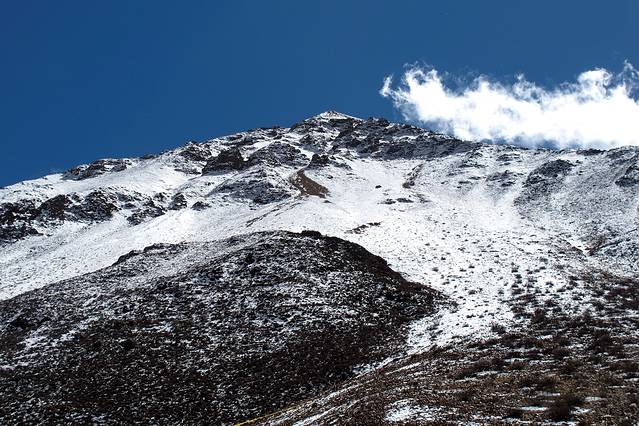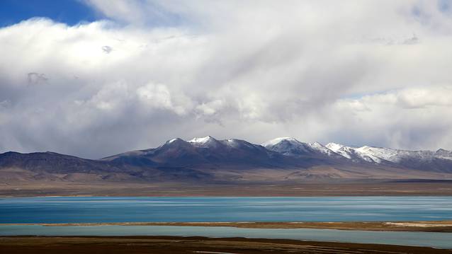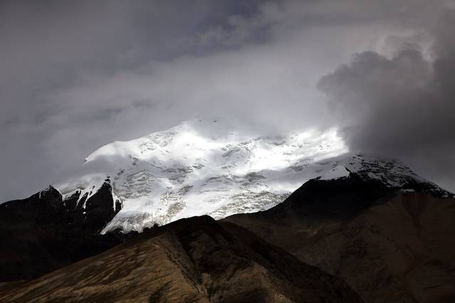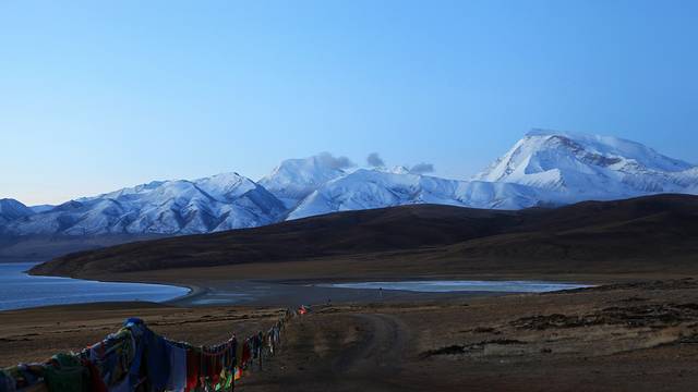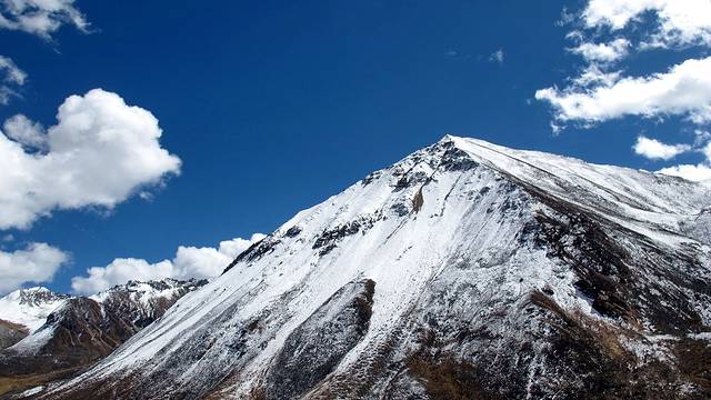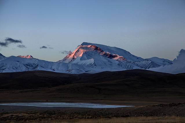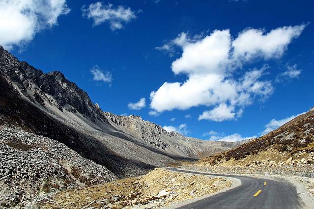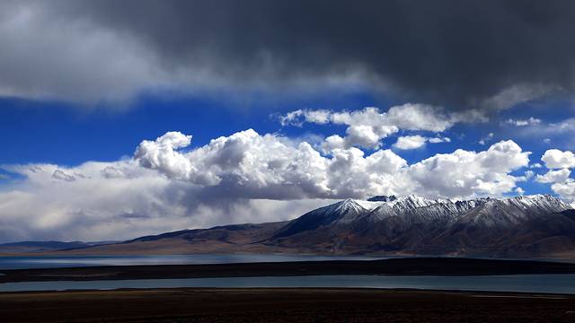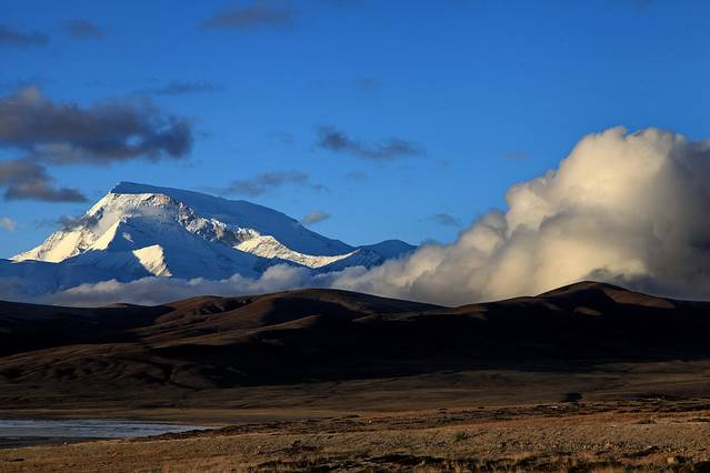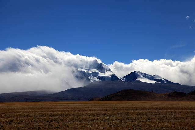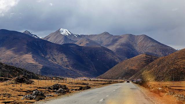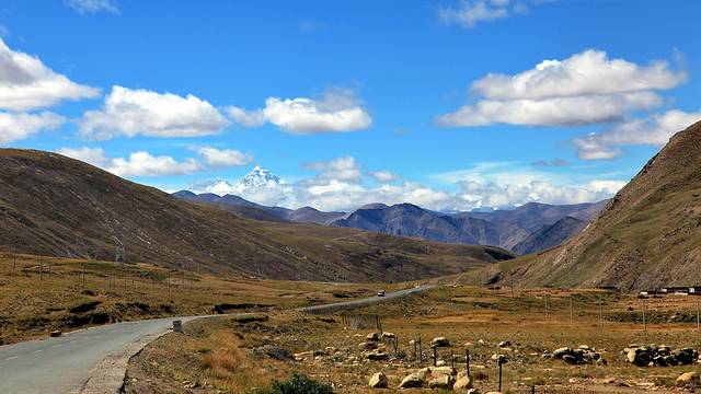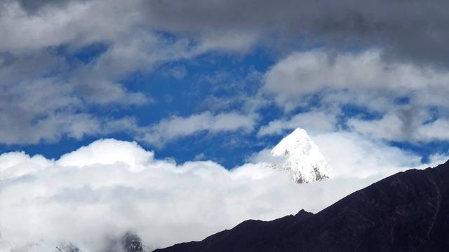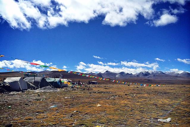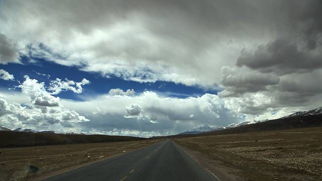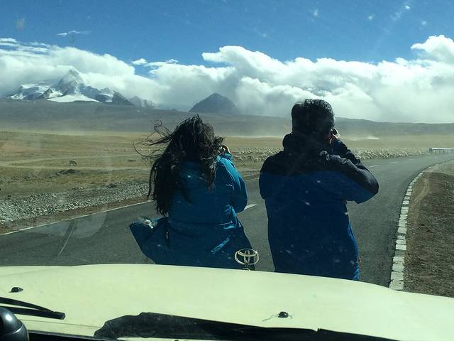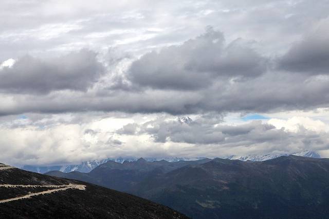 眼前的这座山就是米拉山。远远望去,山头的积雪极少,裸露出大片深黑色的山体。车子绕着盘山路一直得走到海拔5013米的米拉山口。此时,蓝天与白云与我们一起同行。照片所在的位置与2013年冒着暴风雪穿越米拉山一张相片中所拍摄的位置非常相似。时光好似可以来回穿梭,现在的感受、那时的记忆,纷纷交织在一起。