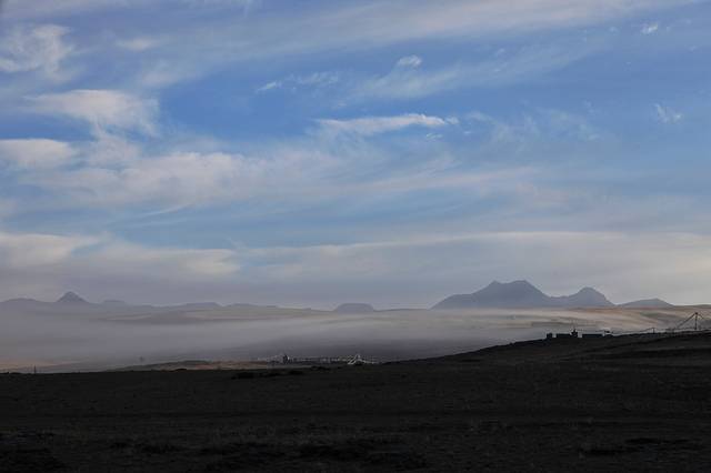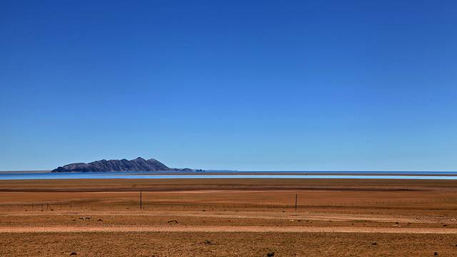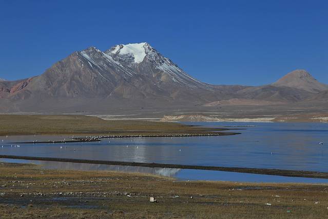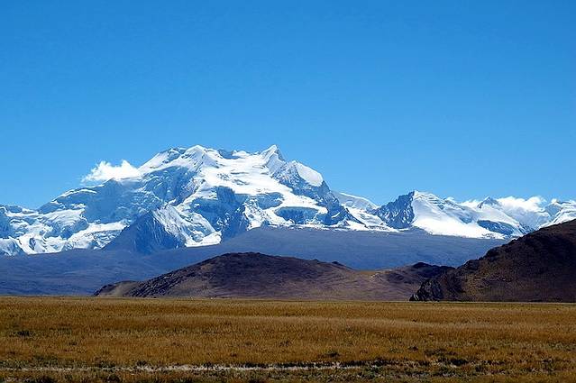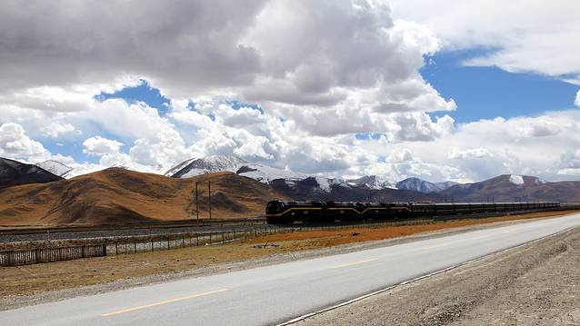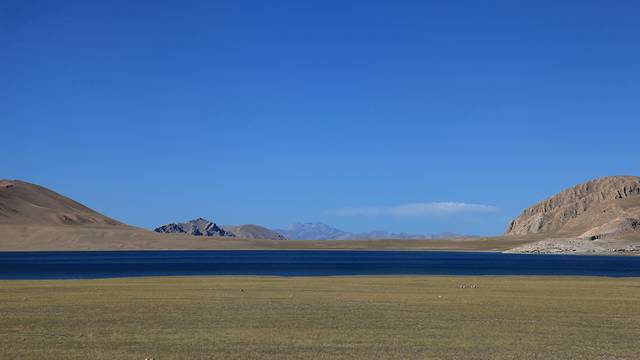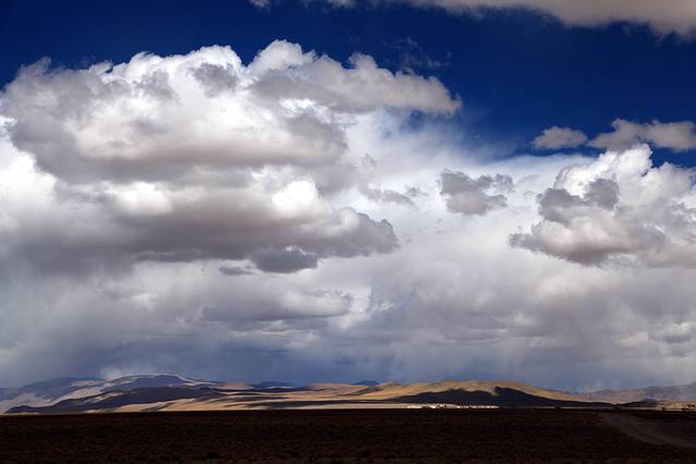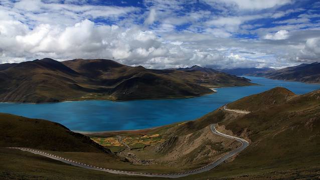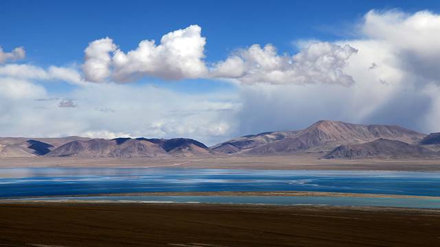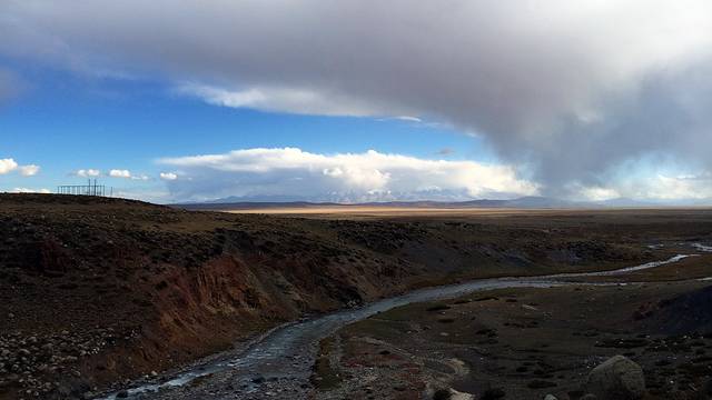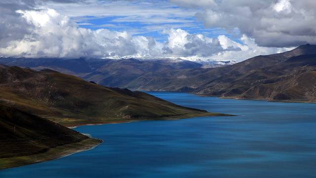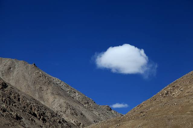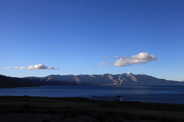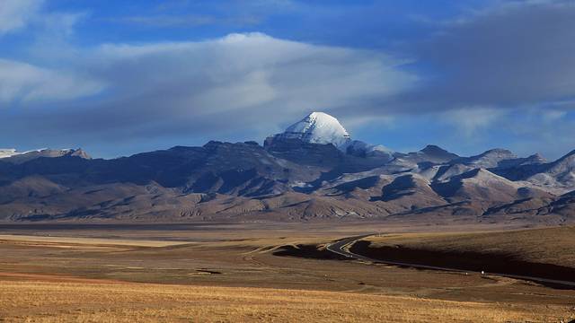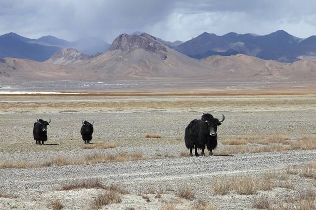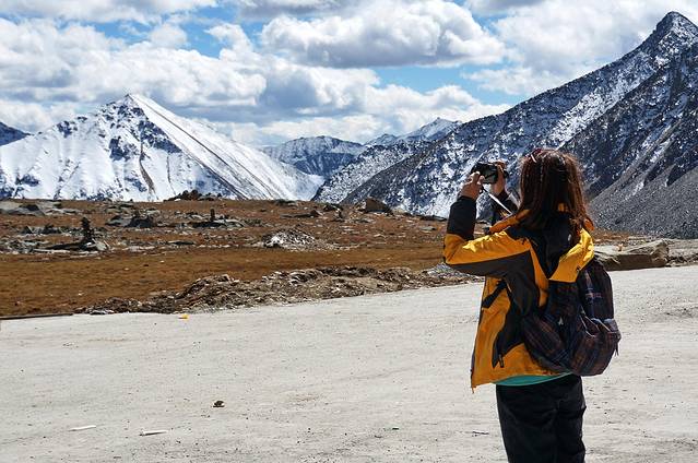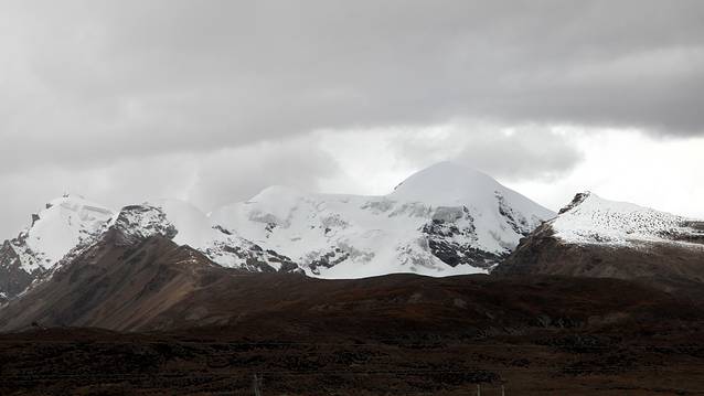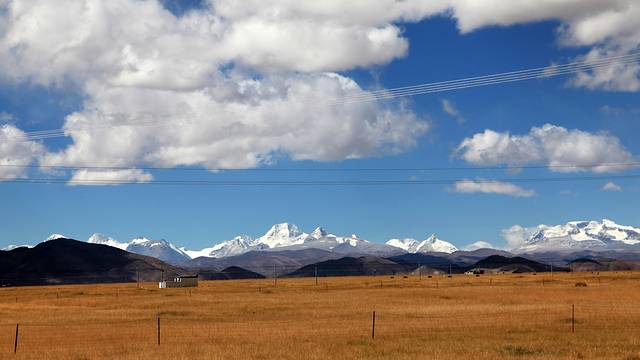 眼前的这座山就是米拉山。远远望去,山头的积雪极少,裸露出大片深黑色的山体。车子绕着盘山路一直得走到海拔5013米的米拉山口。此时,蓝天与白云与我们一起同行。照片所在的位置与2013年冒着暴风雪穿越米拉山一张相片中所拍摄的位置非常相似。时光好似可以来回穿梭,现在的感受、那时的记忆,纷纷交织在一起。