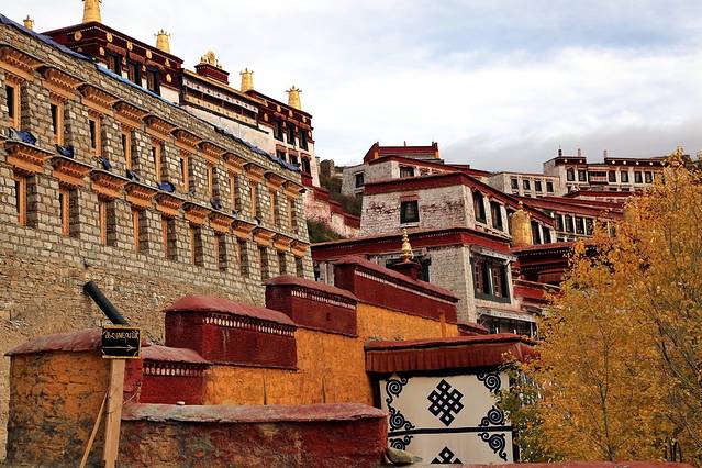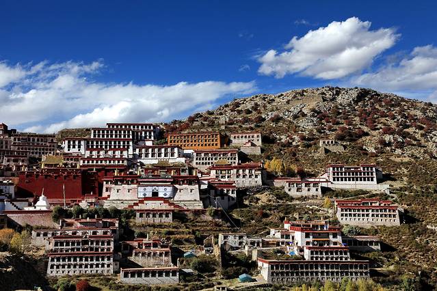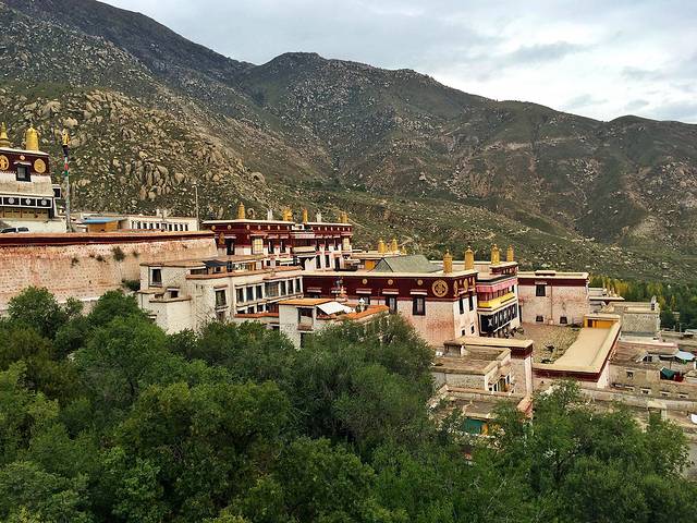 这里是黄教六大寺中地位最为特殊的一座寺庙--甘丹寺。甘丹寺是藏传佛教格鲁派(黄教)创始人宗喀巴大师在藏地推行宗教改革,于公元1409年亲自建立,它是格鲁派的第一座寺院,也是格鲁派的祖庭。联想起一月前在哲蚌寺的一座宗喀巴大师塑像前不自禁流泪的画面,直觉冥冥中好像有一根牵引的线将我带来这里。甘丹寺傍山而立,顺势铺展,气势极为壮观。