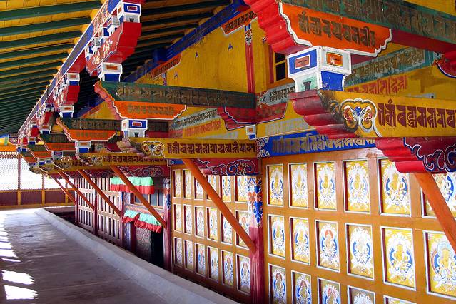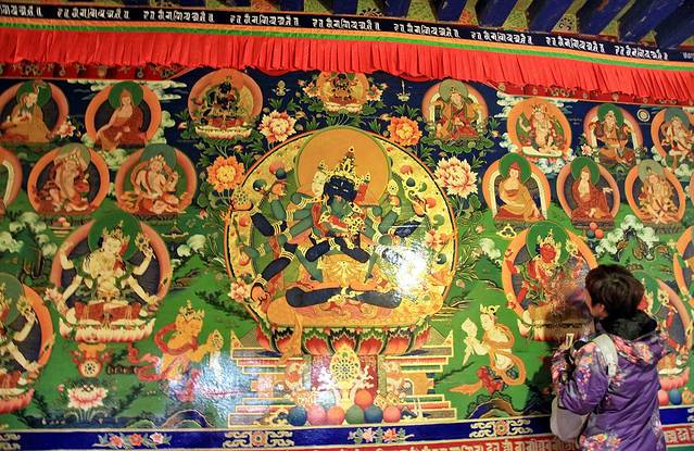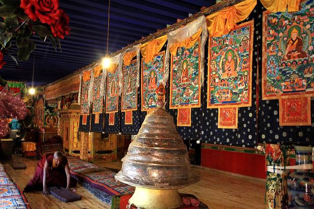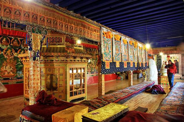 “头脑风暴”后,我们上到了4324米的海拔,这里是宗喀巴大师的灵塔殿。殿堂内,宗喀巴大师的唐卡一张接着一张悬挂着,四周的墙壁上留有极为精美的壁画,装扮出整个殿堂的金碧辉煌、气宇轩昂。大殿中央,还有两位年老的喇嘛在一遍遍地磕着长头,专注而宁静的神态与身姿透着坚定与虔诚。