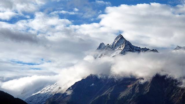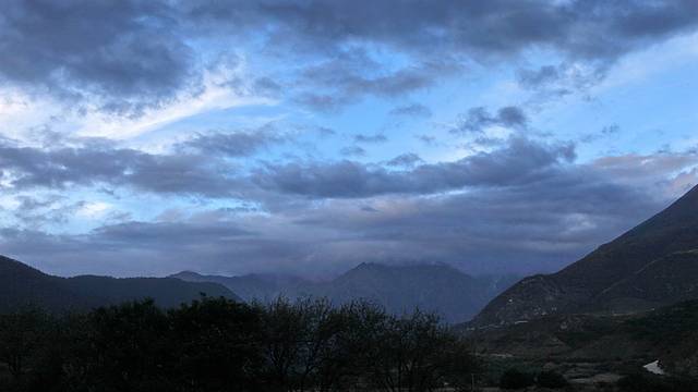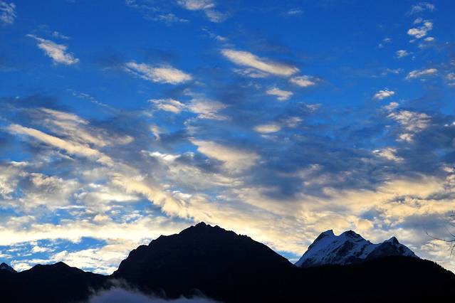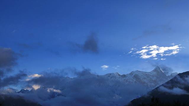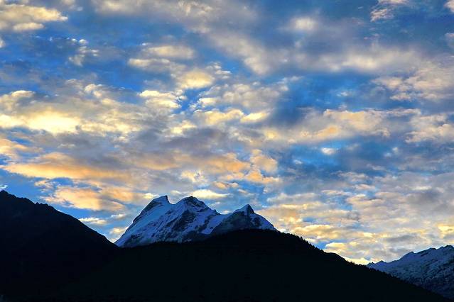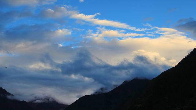 只一小会儿,云雾纷至沓来。夕阳的余晖挥洒在色季拉的山体上,仿佛金色的流水淌过豪迈的山坡,整个色季拉山沉浸在一片温柔的萦绕中。
