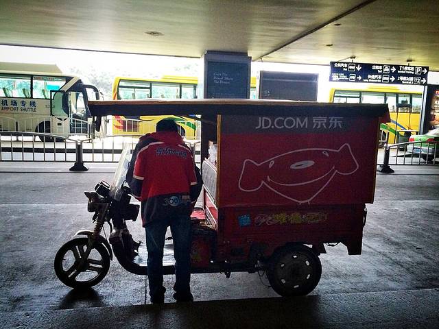 一段旅程的落地,是另一段旅程的开始。12点55分,抵达一如既往白茫茫天的成都,跟谢大哥联系上,下午的时间就跟着他混了。机场门口的京东小车,相当迷你,很是可爱。