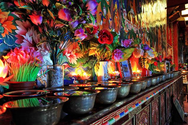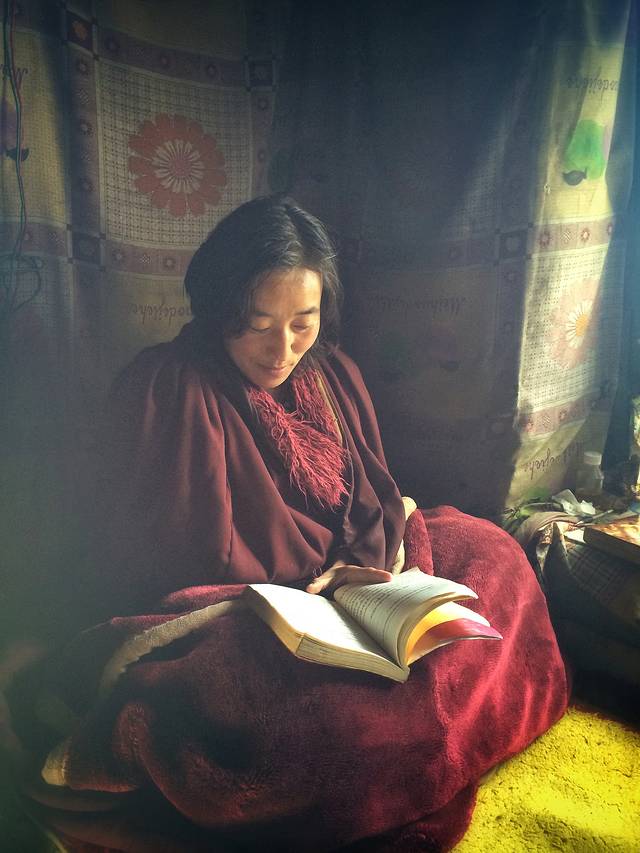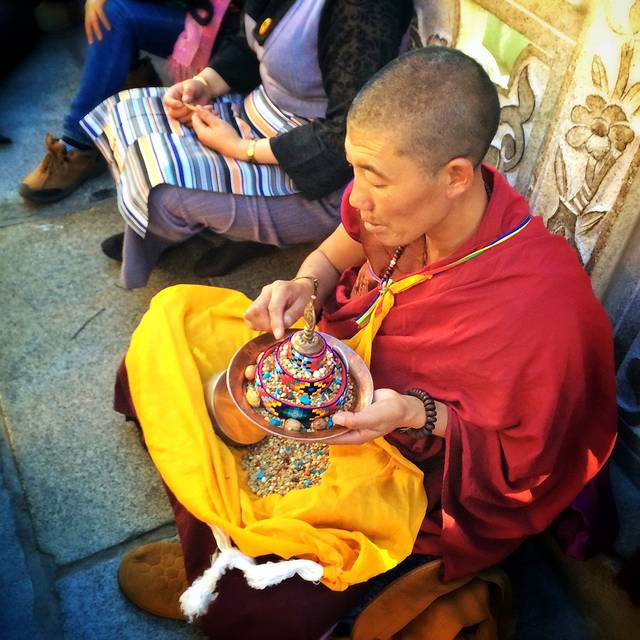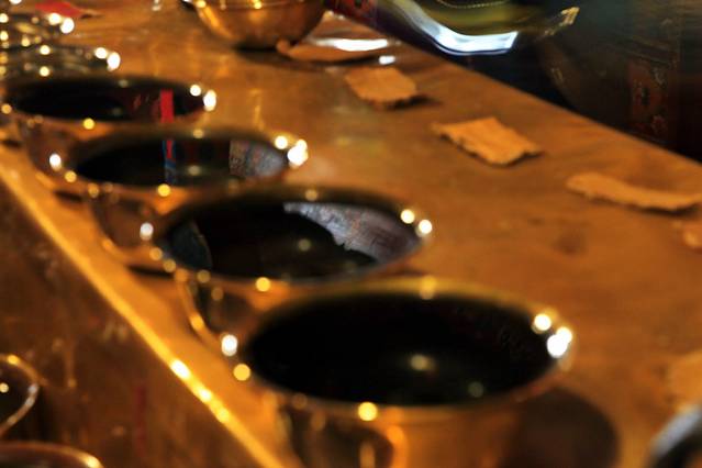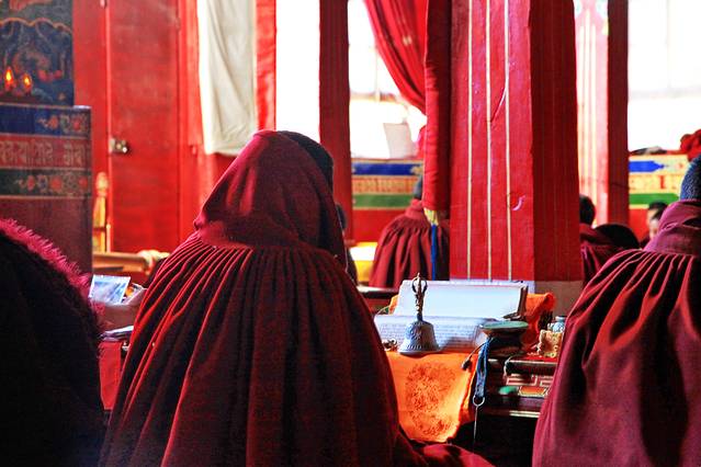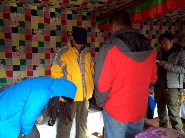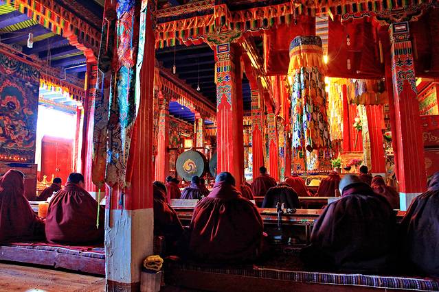 进入措勤大殿,近百位喇嘛正在举行法会。我们喝了些甜茶,小坐了一会儿。小妹问我,他们要去财布施,你去不去?我疑惑地问她,什么叫做财布施?她说,就是向喇嘛们布施钱财。她已经换好零钱,若我去的话,待会儿跟着她就行。我说,好。我跟随小妹给每一位喇嘛的身上放上一块钱,若是指定的喇嘛有放两块的,还给带领这场法会的喇嘛放了三块。这一个圈走下来,我也渐渐感受到了财布施的滋味。当你真的很用心地将钱财散出去的时候,那份由内而外的喜悦真的无比畅快。