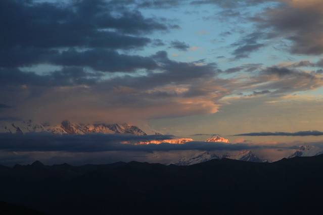 瑰丽的霞影轻吻着壮阔的南迦巴瓦,白色的雪山与朱霞间演绎了一幕浓烈金红的绚烂,直达高潮。