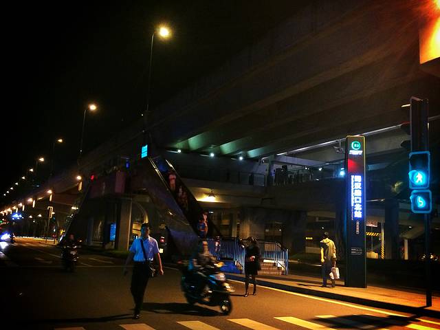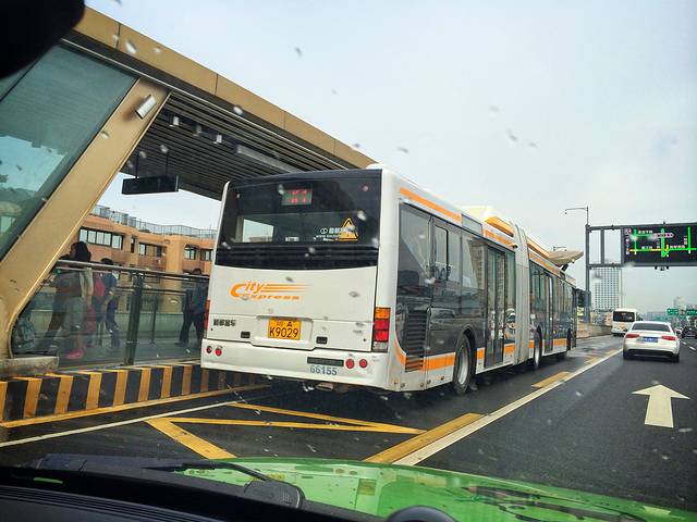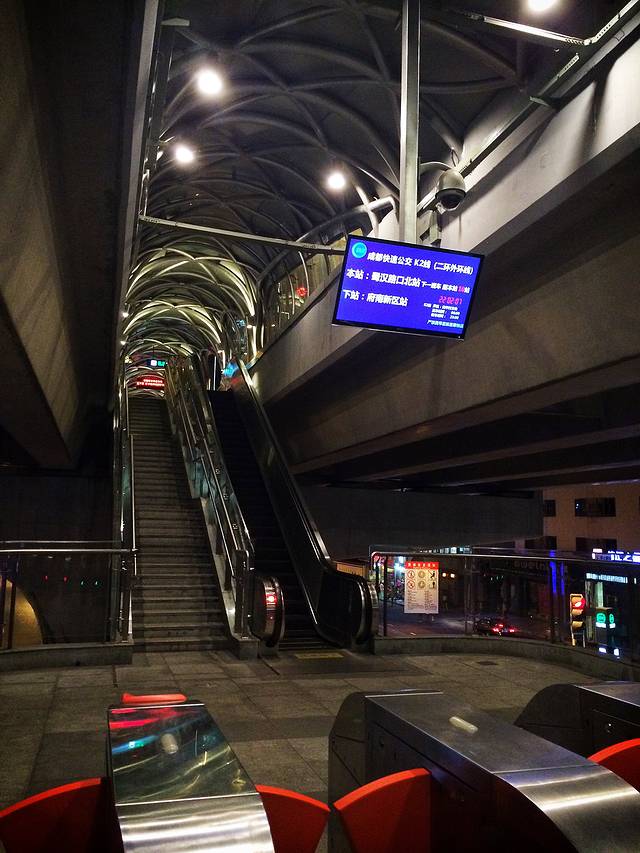 二楼是灯光明亮、设计时尚的站台闸道。闸道旁设有自助售票机,显示屏上则清晰地显示着公交线路名称、本站站名、下一车站站名与末班车时间点。乘车站台还需刷卡上到高架桥上,当时若不是身旁只有大钞、没有硬币,我还想买张车票去高架桥上体验、观赏一下。