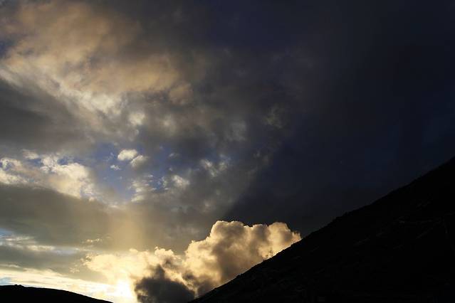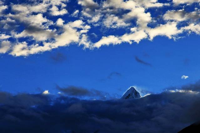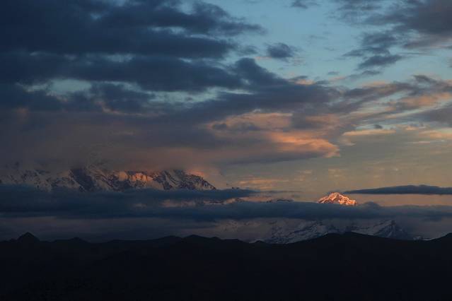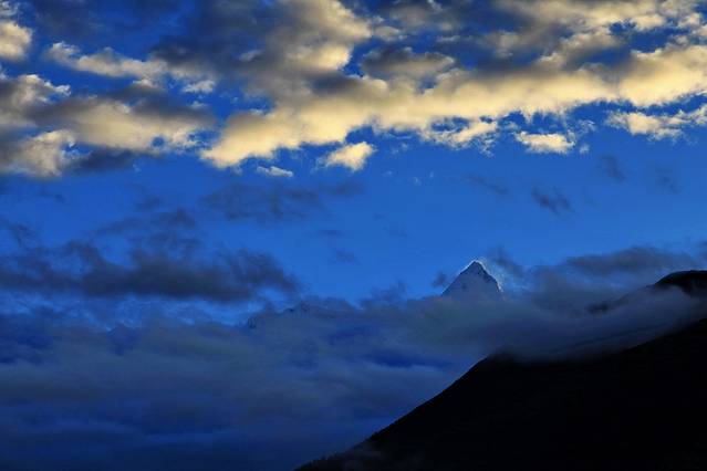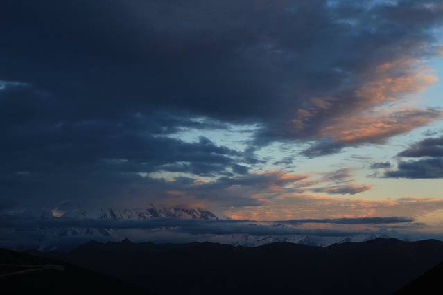 见天时临近晚上六点,所有人急匆匆地往回赶。我想在色季拉山口与南迦巴瓦做此行最后的拥抱,而尚小弟也想一圆他的心愿。开去垭口的路上,我们几次得见南峰在云雾挥起的纱巾中探出直刺天空的身姿,尚小弟让朋友别停车,尽快开到垭口,却没想因此错过了见它的最后时机。半小时后,我们站上了色季拉山口,等待南峰日落的上演。