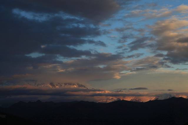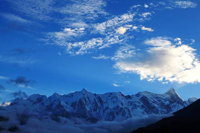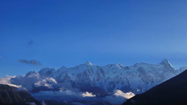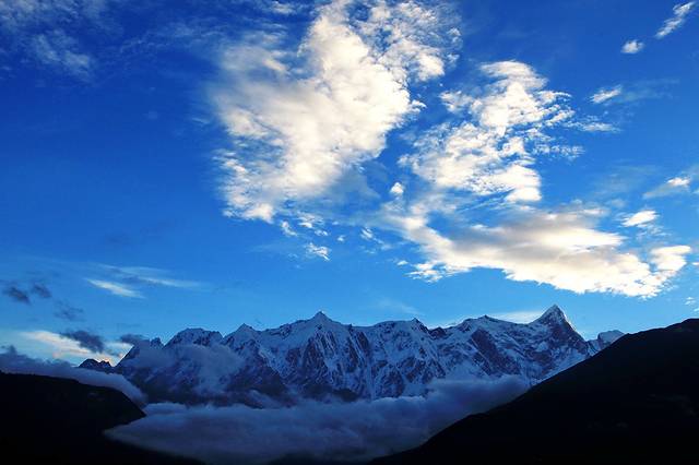 流云在雪峰间飘荡,红光依稀。