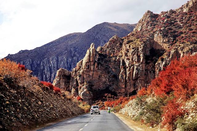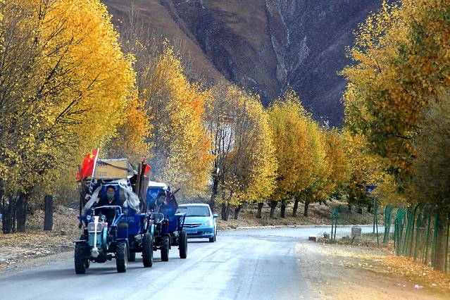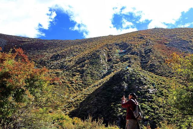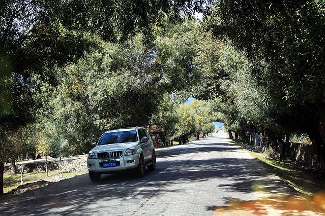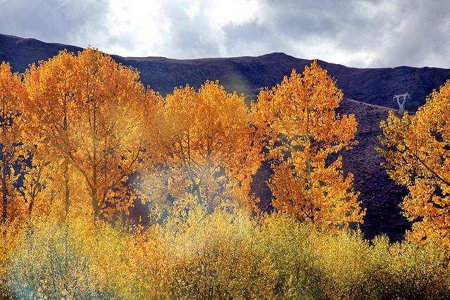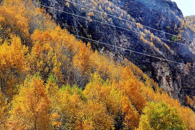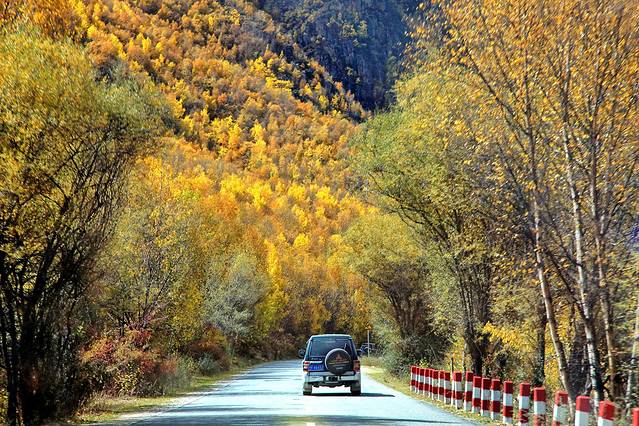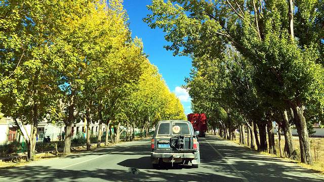 318国道旁浓郁的色彩与风景堪比黄龙与九寨(除了没有水)。我一途欣赏,一途拍摄,四季的高原或此时是最为高潮的绽放,我们如此幸运,坠落在无边无际、精彩绝伦的盛放之中。当车子极速驶过胡杨树林,黄橙橙的树叶在风中卷起又飘落,我瞬间穿越至刀光剑影的武侠仙境,想象着自己是一位武林中曼妙的女子。
