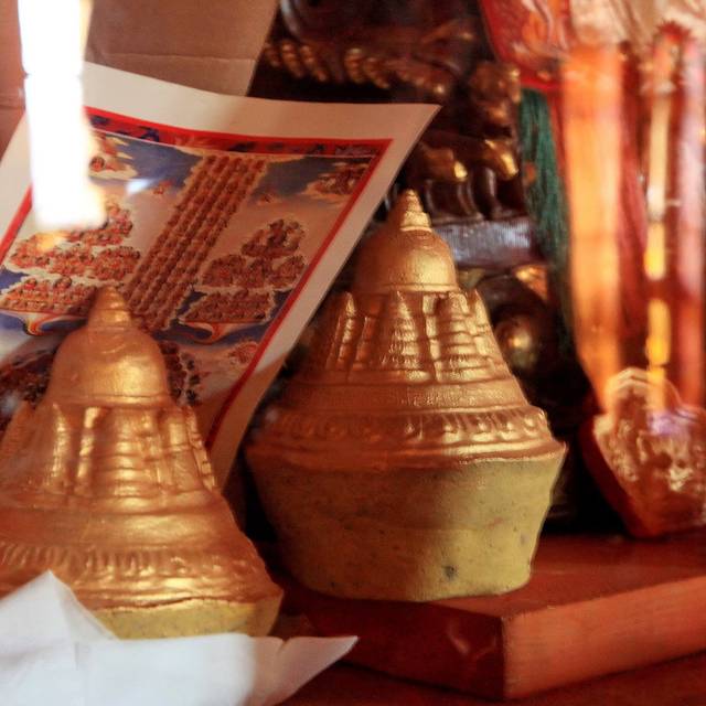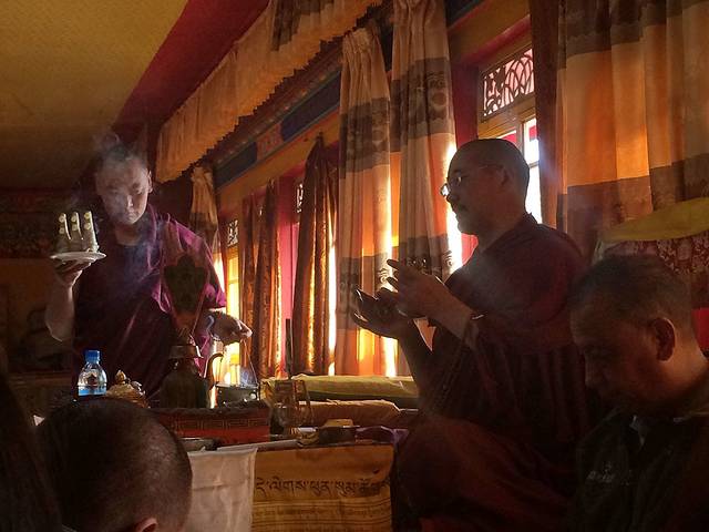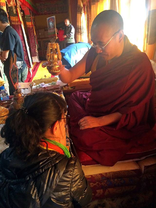 9点56分,为甘丹寺传授密法的格西活佛为我们举办了一场金刚萨埵的灌顶仪式。金刚萨埵,是藏传佛教密宗极为推崇的圣尊,是消业灭罪的唯一主尊。听天津佛教协会的丹增师傅说,金刚萨埵可以消除无量界所有的业力,消除末法时代一切罪恶,恢复人类本有的智慧,让我们可以自主,有机会不堕轮回。我从来没有经历过这样的时刻。原本我还以为摸摸脑袋就叫灌顶,这下方知灌顶仪式有其非常细致与严谨的程序。一个半小时的仪式过程中,格西首先介绍了灌顶的前提条件,并非他人要求或受到强迫,而是你自己请求灌顶,接着大家一起共同请求,请求去除障碍罪孽的轮回;接着开始念金刚萨埵的百字真言;再接着,格西介绍了四种灌顶--身灌顶、语灌顶、心灌顶和功德灌顶,逐一介绍完毕后再一一进行四种灌顶的引导与观想。仪式过程中,他会念起经文和咒语,还不时敲击法器,有时候会让我们跟着他一起念颂,不明白意思不要紧,就跟着他一起念读就好。整个过程下来,感受很细微,很难以用言语来表述。