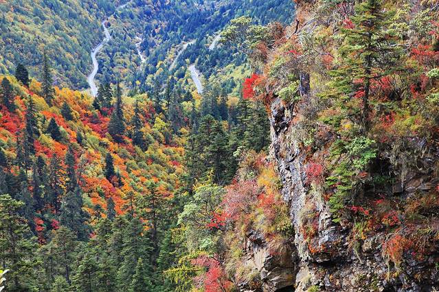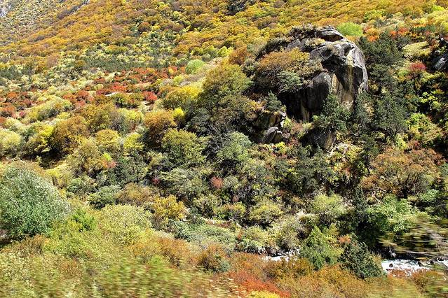 我们的车不断地在盘山路上爬坡,往垭口开去。深秋的色季拉山映入眼帘......之前的两次前来,均是2、3月间高原的冬季,见到的统统是深褐色、萧瑟与单一的山景。此时,我惊讶于斑驳陆离、宛若一副缤纷油画的色季拉山竟是这样的美丽。怪不得尚小弟说,色季拉山是他所见过的最美的风景。这一次,我也被色季拉山的美艳所深深吸引,我立马跳出了失落身份证的窘迫,这般色彩磅礴、好似九寨斑斓的山林世界,简直是可引发尖叫的美丽胜地。