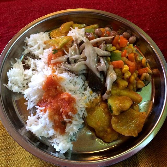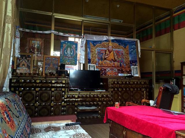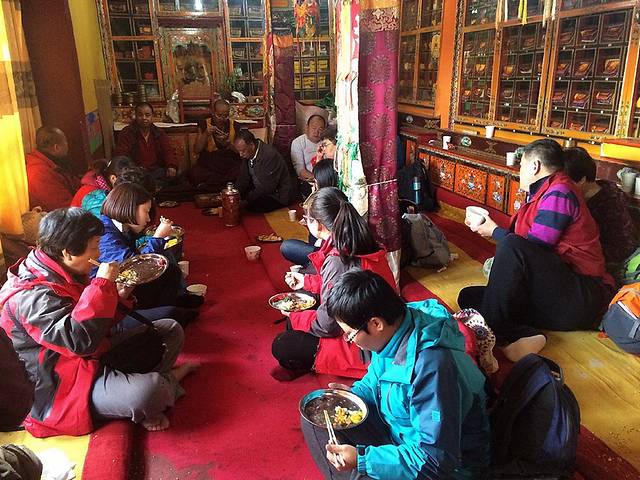 时间接近下午一点半,我们回到刚才灌顶仪式的殿堂休息。喇嘛们为我们倒上甜茶,格西活佛跟我们一起吃饭。我们排着队伍依次在门口打饭,两个荤菜、两个素菜,一个汤。第一次在庙宇中以这样的方式吃饭,还真是很有感觉呢!我也第一次晓得,原来喇嘛们都是可以吃荤的,而不是像和尚一样必须素食。