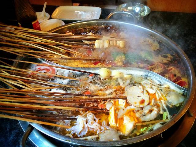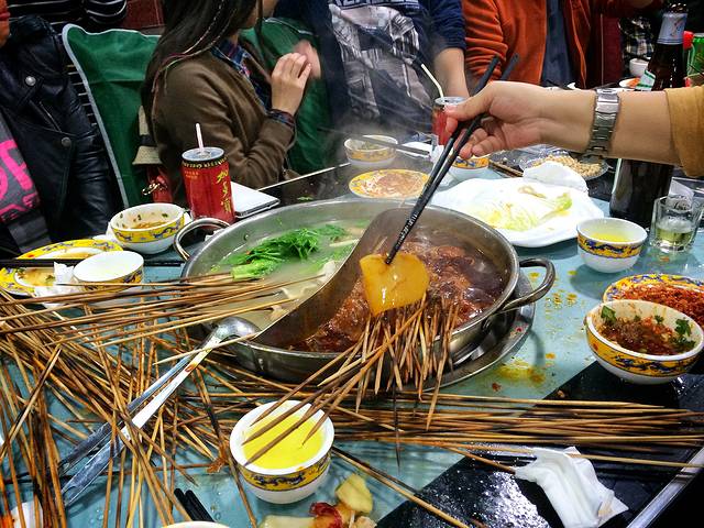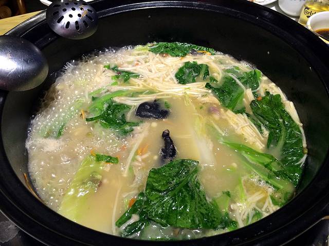 于是,见着满腹食料的川工第一漂,便大吃大喝起来。这是我第一次听说“漂汤”这个词儿,锅超大,里面啥都有,荤素搭配,大杂烩,汤也蹦香。