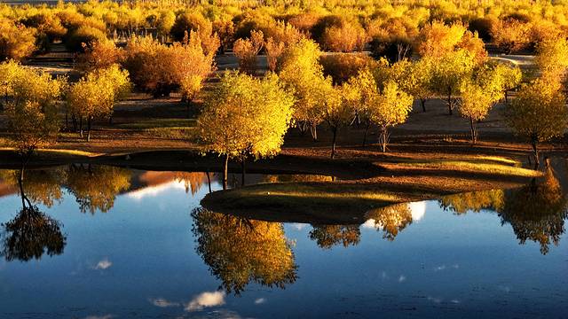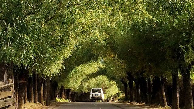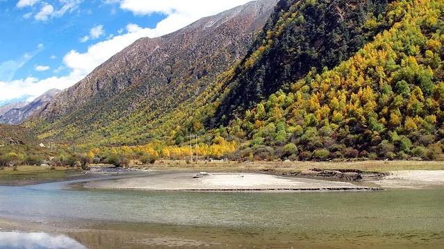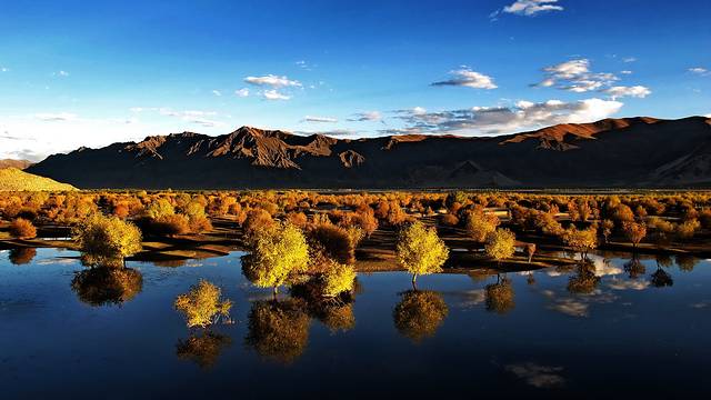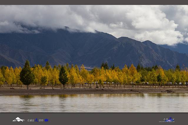 进入墨竹工卡后,又是另外一番景致。我们再度穿越到胡杨林的金色年华中,灿烂的阳、黄橙橙的林叶,简直美到令人窒息,任何的辞藻都如此惨白。