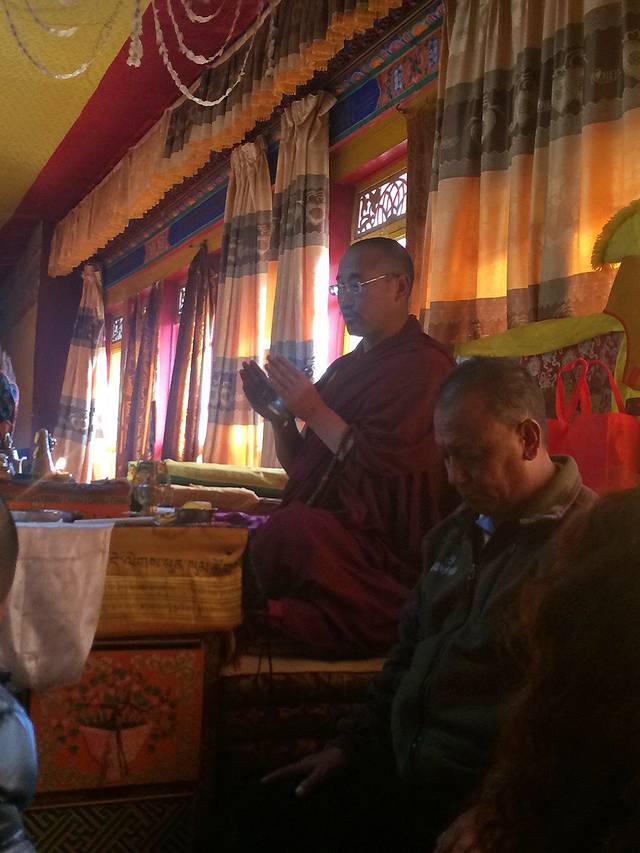 午饭后,开始了格西活佛与丹增师傅的问答时间。有佛友问格西,什么叫做空性?格西让丹增说,丹增师傅侃侃而谈:空性就是对事物的看法。我们的看法是从眼、耳、鼻、舌、身、意六根中产生的六实,六实带来了那个业,痛苦,让我们不能自主。我们学佛,是透过磕头和念经的方式改变之前的六实,再造一个实,而这个实是通往解脱的。爱的心和恨的心都是属于“我执”,而学佛的心是超越实的心,是清净的心,是根除掉执着的心。我们学佛就是在主动选择,控制自己的心。佛友又问,菩萨有没有业力的烦恼?格西说,作为菩萨,他们在入定的时候是没有执着和污染的,当然醒来的时候也有会有一些业力烦恼,学佛就是来根除这些业力烦恼的。格西还强调,我们在做任何事情的时候,我们都要问问自己为什么这么做,是利益自己的还是利益他人的。我们要从利益一切众生做起,从利益身边人做起。三恶道就在起心动念里。我认真地听着他们的交谈,我觉得非常有意思,他们学佛,我学的是心理学,虽然描述出来的语言结构、用词或许不同,但是我们对于事物的理解竟然如此一致。原来佛学与心理学在本质上是相通的,他们说的,我都懂,也都认同;我说的,他们也懂,也很明了。这样的发现,让我觉得佛学其实是一门通往心灵与真相的学问却并不是一个宗教,佛学是解读世界的根本法。