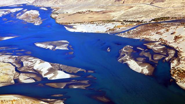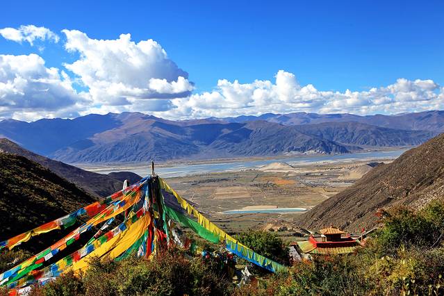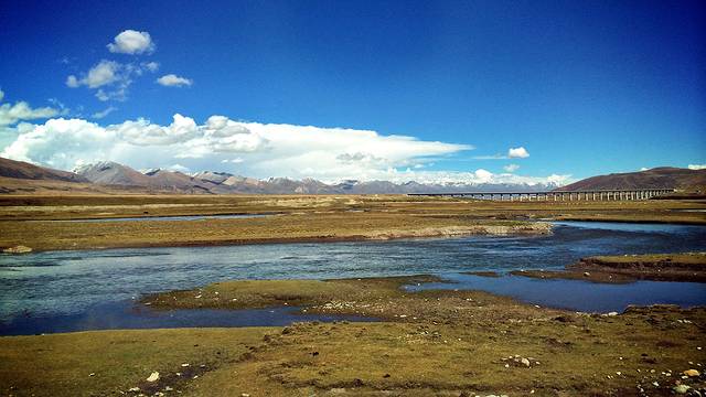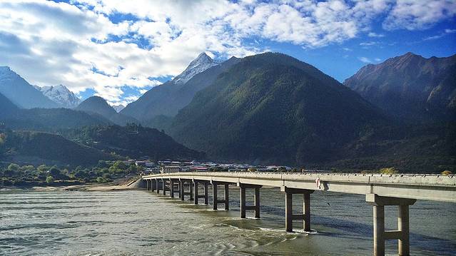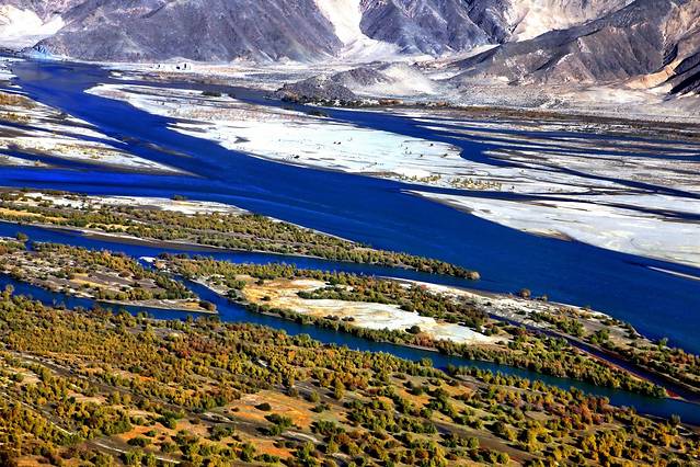 一条大桥横跨布满沙洲的雅鲁藏布,一片片艳丽金灿的胡杨林点缀着高原澄澈的蓝天白云,宣告秋日深情的浓墨重彩。这座大桥也是我们进拉萨的必经之路。