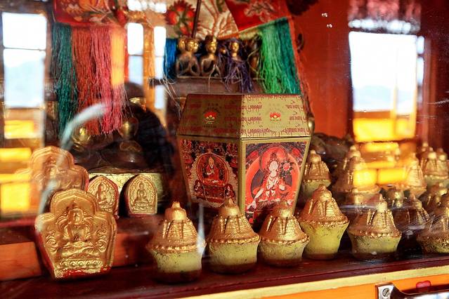 殿内的玻璃橱内摆放有很多以土为主要材料做成的小佛,以及佛教贡品。喇嘛说起有一尊行如宝塔的佛品的故事:在甘丹寺建寺之后,多出来很多的土,于是喇嘛们就用这些土做成了一个个像塔模样的佛品。可没想到,两年后,在它们的身旁,多了很多跟它们长得一模一样、却身形比它们小得多的“小塔”。众喇嘛感觉非常惊奇,于是“土生土”的故事就一传十、十传百得传开了。接着,喇嘛们就用这些神奇的“土生土”做成了一尊尊不动佛。我们听了之后,也为之惊诧不已。