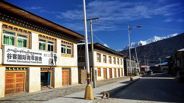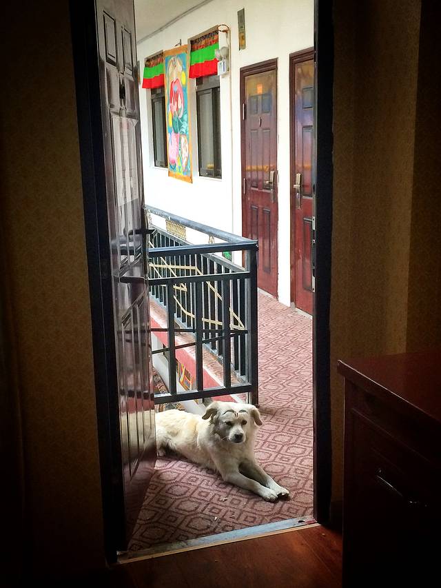 下了民航班车,打一辆三轮直奔小妹的客栈--拉萨云上生活客栈。客栈地处离宗角禄康公园十分钟步行路程的娘热中路上。当然,这也是我第一次来到这里。一转悠,这里是一个四层的楼房,一楼是多人间,二楼以上是标房,每间房都配有电视、无线网络与暖气,还有自助厨房可以自己料理食物,更有一条被佩思画上眉毛的大白在窜上奔下地欢迎主人的回家、朋友们的到来。
