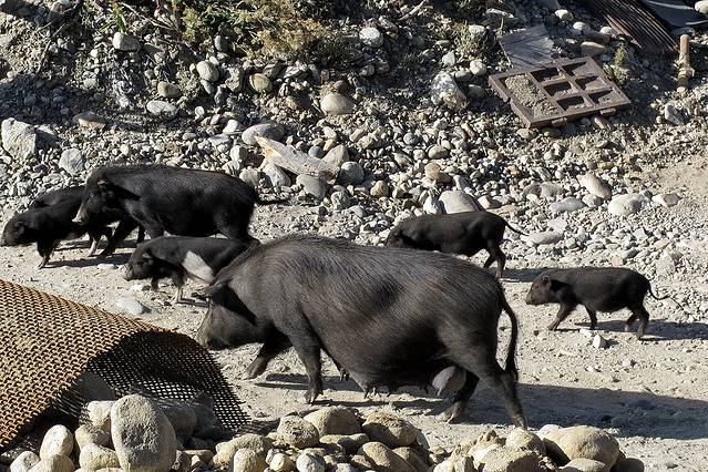 大大小小的藏香猪“一家”从身旁走过~~~这些小猪仔们扭着屁股,可爱不已,只是身上味道实在臭得“轰轰”,忍不住急走几步,绕过难闻的气味。
