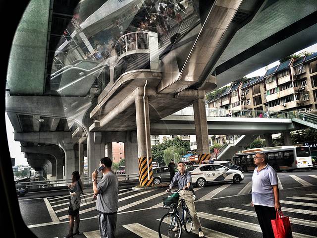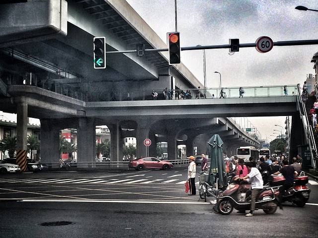 这是高架桥上的一处快速公交站台--蜀汉路口北站。公交站台与高架桥相依相伴,不过得上楼才能得见真模样,于是我好奇地走了上去。