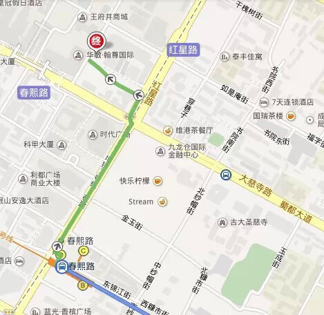 步行710M到“成渝立交站”,地铁2号线(犀浦方向7站)“春熙路”下,D出口,步行650M。