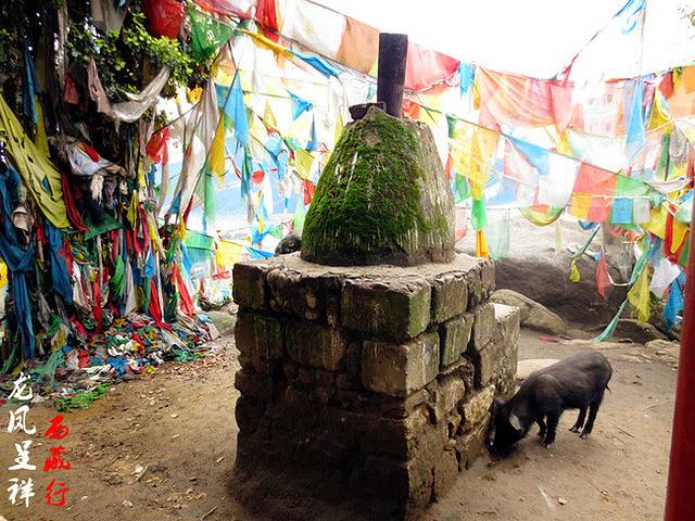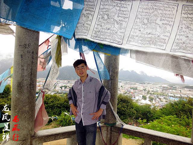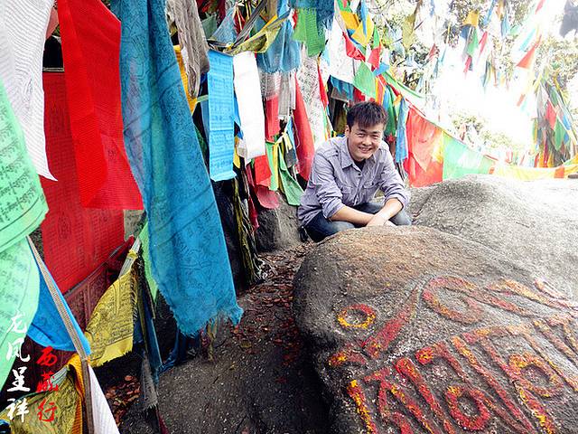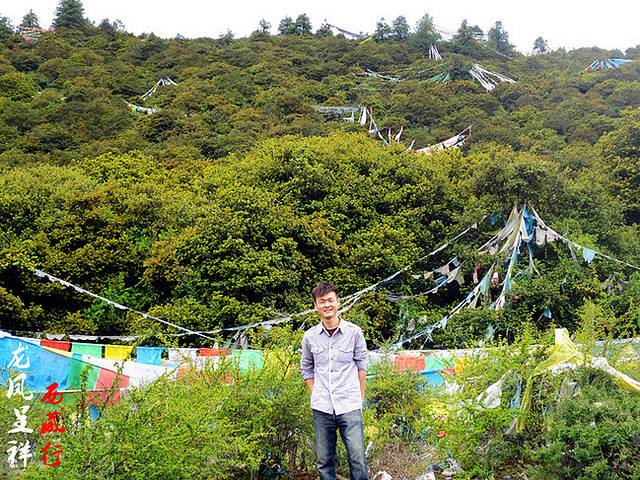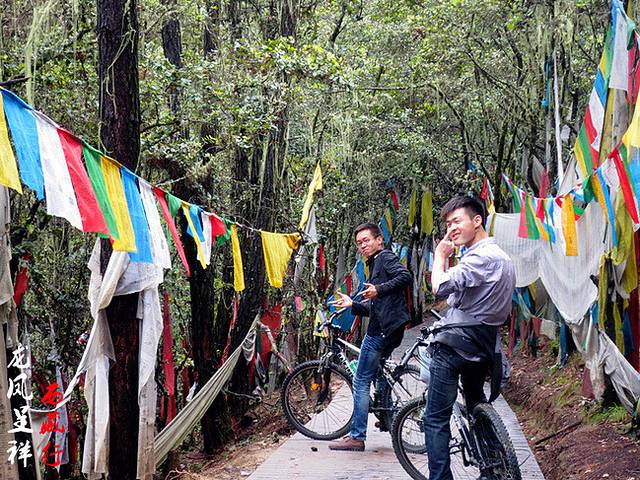 朋友告诉我们今天要去比日神山,柏树林。我们在学校跟前租了3辆山地车,不限时每辆20元,挺便宜的。骑着单车来到比日神山下,丝毫没有畏惧,直接从大坡上往上骑,一半路程过后体力消退的厉害,只好推一段骑一段。在说笑打闹中终于到了山顶。山上有一间比日神阁,房门紧锁。旁边是一户人家,经营着小商店。在商店里吃了碗泡面喝了水晒会太阳,然后沿着另一条木板铺的小路转山。路两边五颜六色的经幡随处可见,寄托着祈愿人美好的祝福。