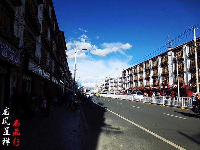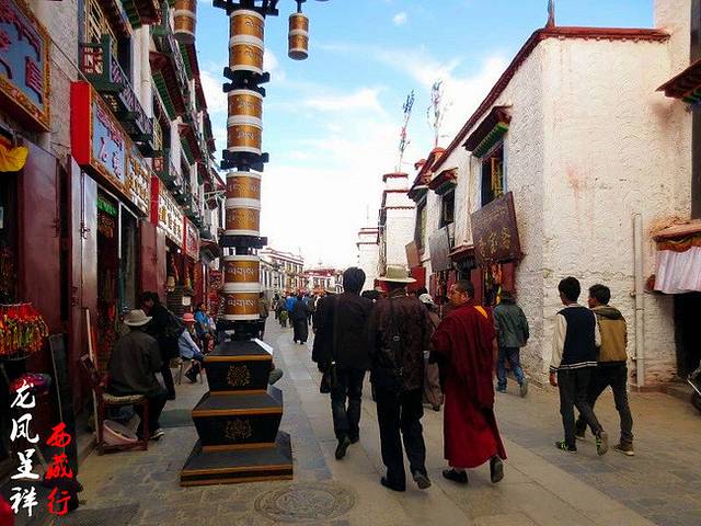 来到八廓街,首先看到的是一个小广场和正对面的大昭寺,门口很多朝拜的藏民,不辞劳苦的只为求精神的满足而不停的跪拜,很震撼很感动。八廓街便是围绕着这大昭寺外墙的一条环形街道,藏风民俗浓郁,商业气息浓厚,各种各样的藏族商品令人眼花缭乱,请记得一定要讲价。游览时值得注意的是藏族的风俗,都是顺时针转经(藏族特色产品交易中心这边为入口),在各个寺庙里里也是一样的规则。八廓街最美的地方就是藏式建筑,白红等颜色相间,最高也不过3层楼,却道出了最美异域文化,蓝天白云陪衬,坐在广场晒晒太阳也是别样的惬意。八廓街有名的玛吉阿米餐馆,现在很受文艺青年,情侣的暧昧,不妨去感受一下。像臧面,酥油茶等藏族特色都是值得品尝,不要因听信别人的不合口味而放弃品尝,尝鲜的滋味是始终都是最美好的,请去尝试吧。