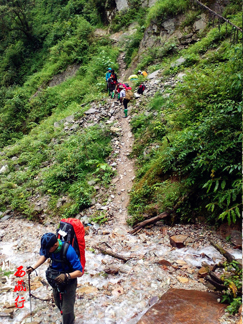 第三天要经过塌方区,滑坡段,老虎嘴,最难缠的是蚂蟥,不过也不用怕,防护措施很有效,过了一号桥成千上万的蚂蟥突然就全都消失了(仅相隔一条河,很神奇的分界)。今天的路海拔起伏较大,连续上上下下的路会让人发狂。