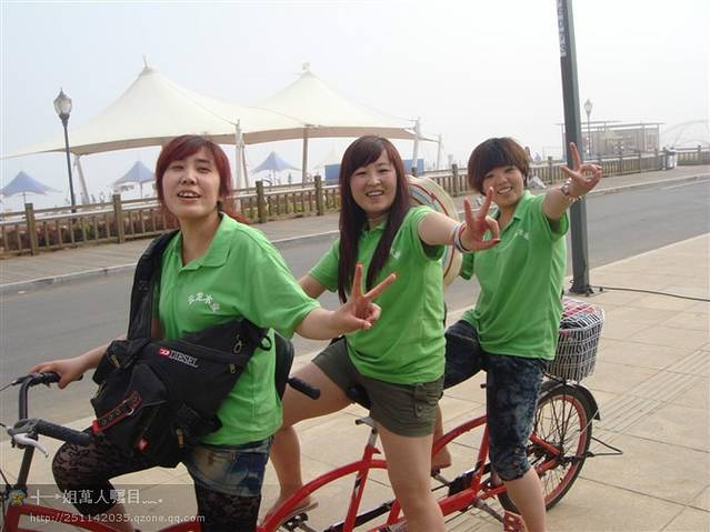 三个人的自行车不好骑。坐在最后面比较省力