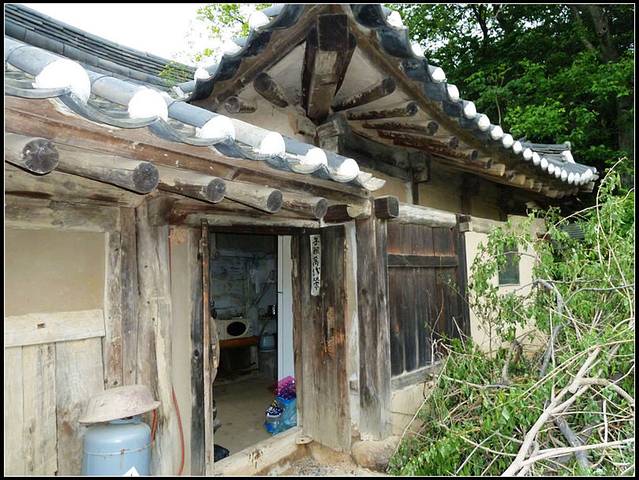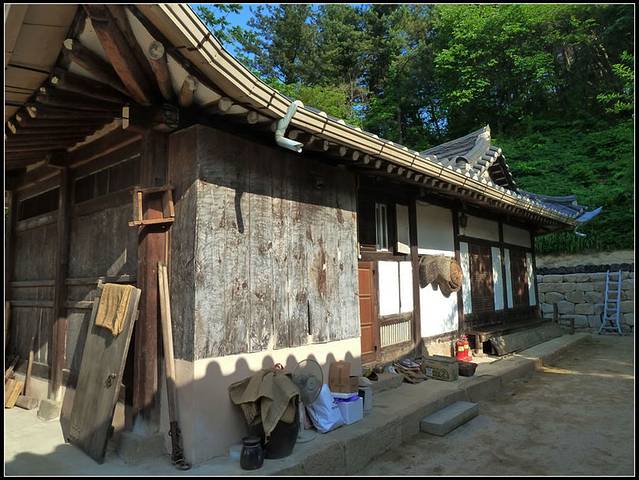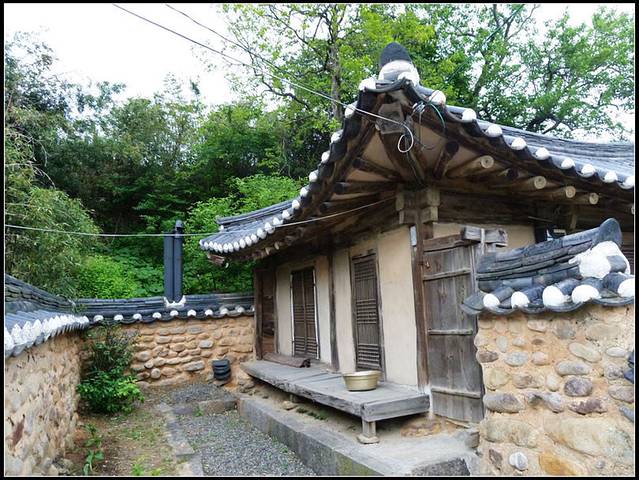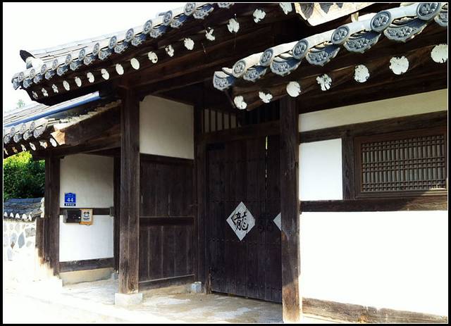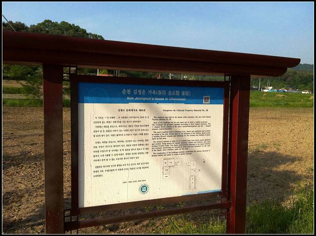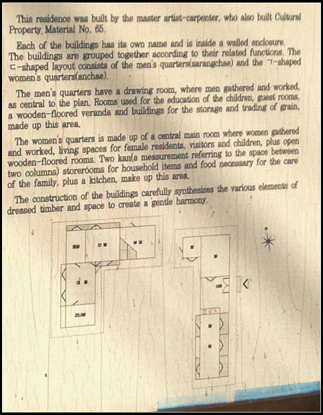木牌上的英文意思是: 该住宅系建造了江原道第65号文化财的木匠艺术大师所造。 每个建筑均各有其名,且以院墙圈围。这些建筑根据其相关功能汇聚。匚–形布局包括男舍(Sarang-Chae)和ㄱ–形的女舍(Anchae)。 男舍有一可供男人聚会和工作的客厅,是设计的中心位置。供教育孩子们使用的房屋、客房、木地板结构的阳台以及储物及交易所用的房屋构成了该区域。 女舍包括一间女人聚会及工作的中央主要房间,女人、访客及孩子们居住的地方、另加敞开的木地板结构房屋。两 kan(指两栏之间的距离的测量单位)大小的储存家居物品及照料全家必需食品的储物间、外加一厨房构成了该区域。