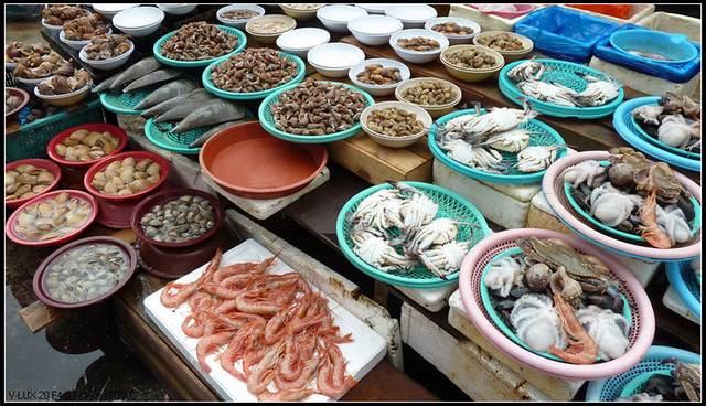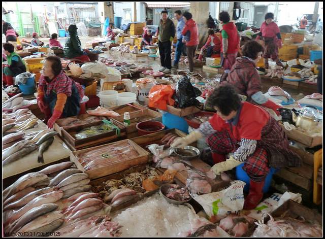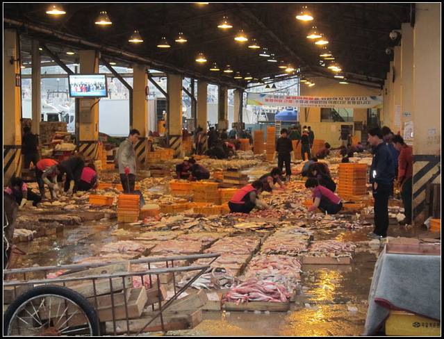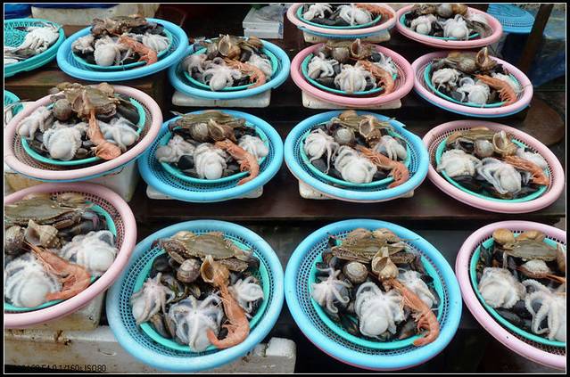 最后的高潮自然是品尝釜山的海鲜。扎嘎其水产市场一楼卖海鲜,可以买了去二楼加工,吃个新鲜。我们到那里已经是晚上七点多钟,一楼已经收摊,海女们正在里面迎接新到的海鲜,而可以观风景的五楼自助餐厅也已结束营业。