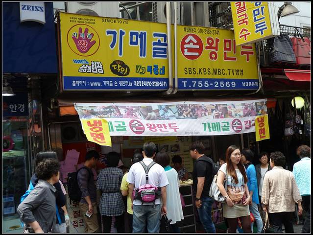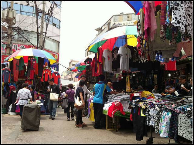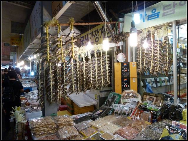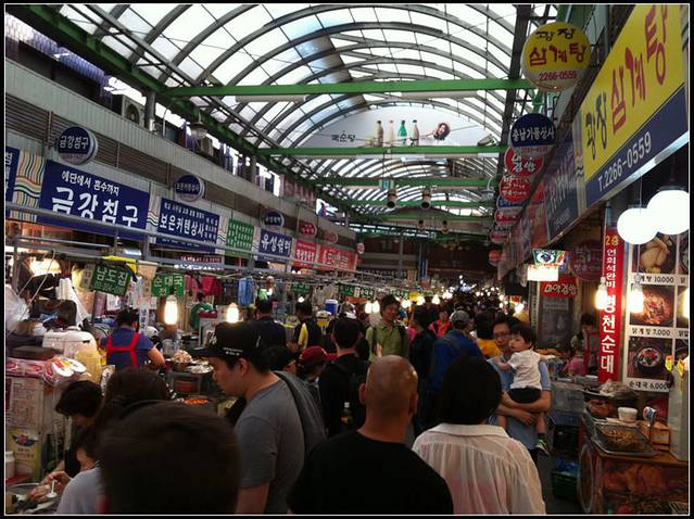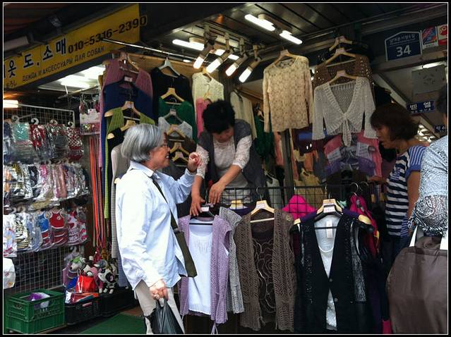 就是南京的金桥、银桥批发市场大门翻版,脏乱差令人发指。市场依然保持着旧时风味,内有三分之一的商户经营衣服布料,化纤质地的服装、做工考究的韩服与蔬菜瓜果、海产品、肉类、结婚礼品、祭祀用品等在同一个舞台上活色生香。