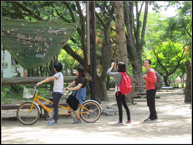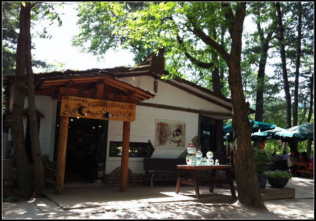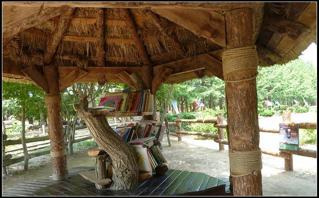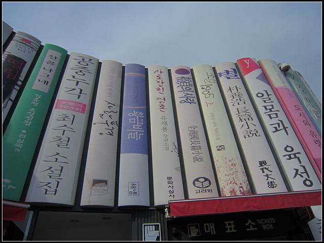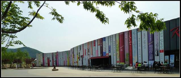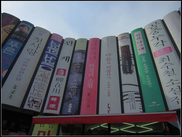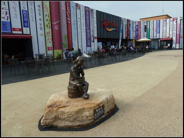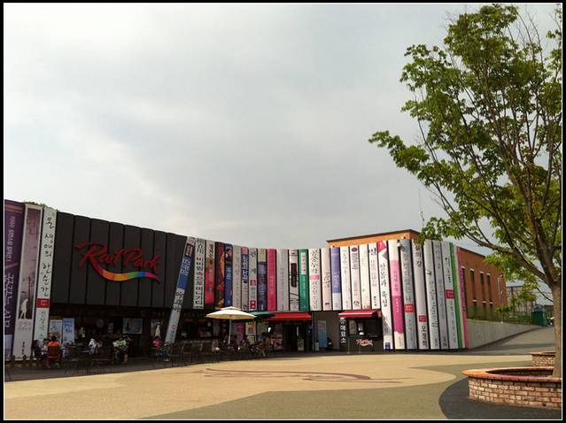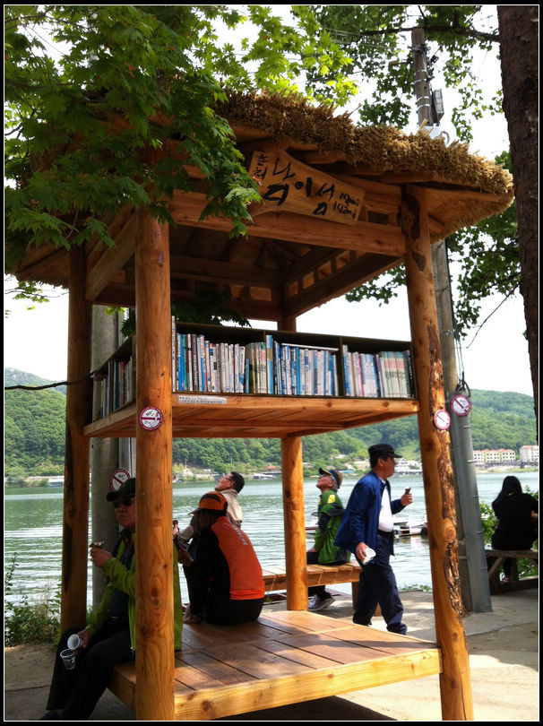 金裕贞得名于韩国的短篇文学的代表小说家金裕贞。金裕贞1908年出生在春川新东面实来村,是光复前朝鲜文坛上才华横溢的中坚作家,1937年去世,年仅29岁。在金裕贞站下车步行5分钟,建有金裕贞文化村,复原了作家的故居,展示了作家短暂一生所留下的作品。可惜这些资料都是我现在发帖时查到的,当时并不知道。但是,在金裕贞,我们的确感受到了浓浓的文化气息。在铁路自行车站的对面,就是一间以书籍作为外墙的咖啡馆,休闲场所都宛如一个大书橱!