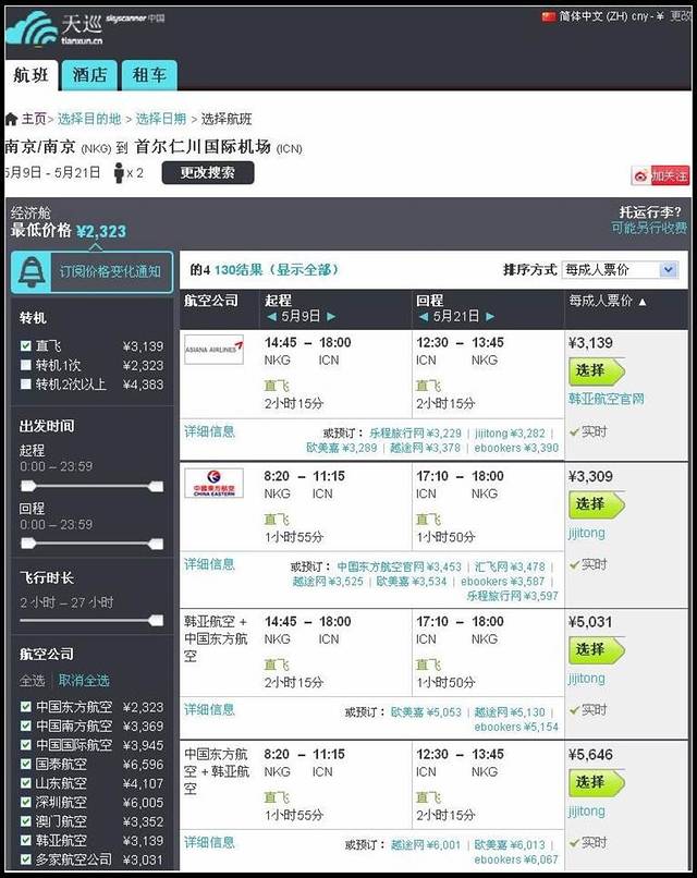 变更后的行程最好还是5月9日到5月20日,这样可以涵盖所有已经付款的预订且不需再去更改酒店的住宿日期。但是上网一看,5月9日飞首尔的票价无法承受,最低也要3139元,几乎是船票的一倍!