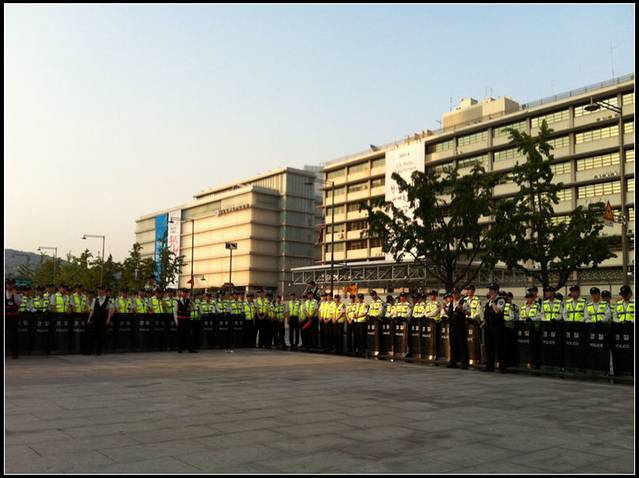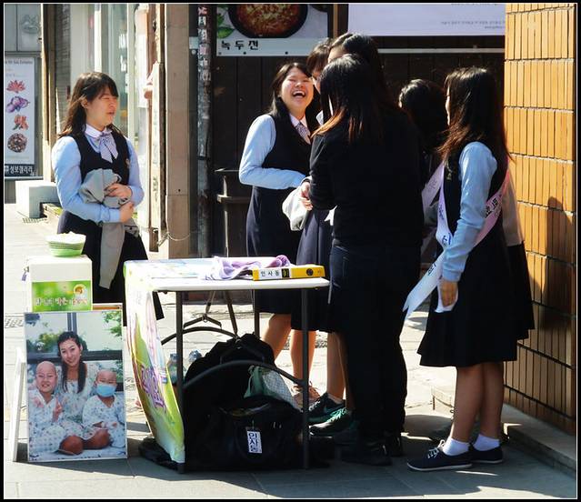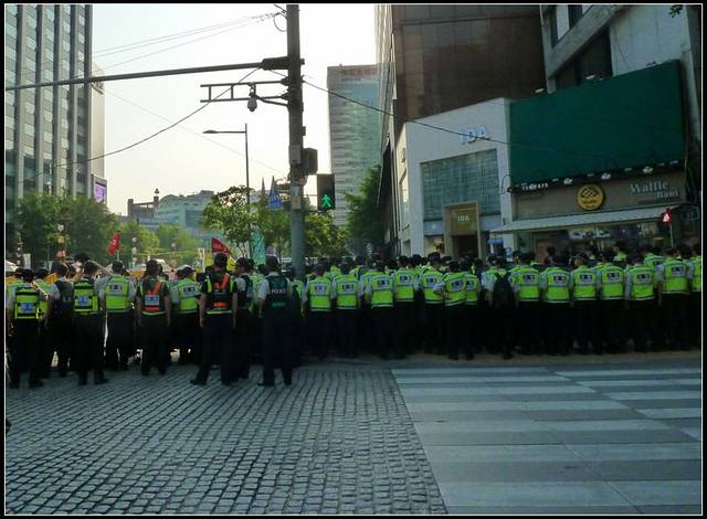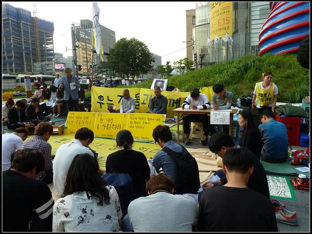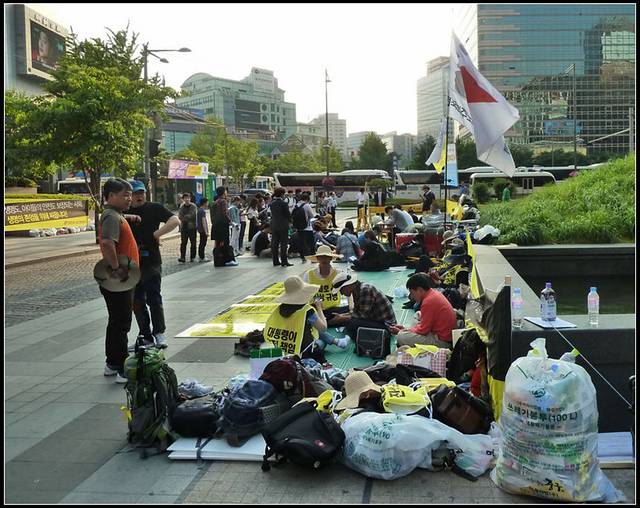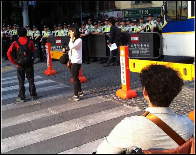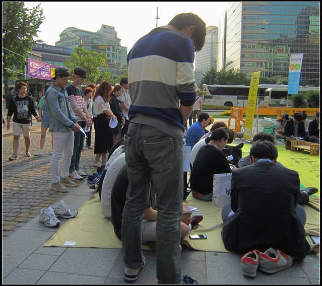 《朝鲜日报》社前,很多人席地静坐,表情凝重。也有人淡定地看报纸甚至玩手机,还有的似乎饿昏了,一副有气无力的样子,不时有过路人在他们身边放点吃的喝的。