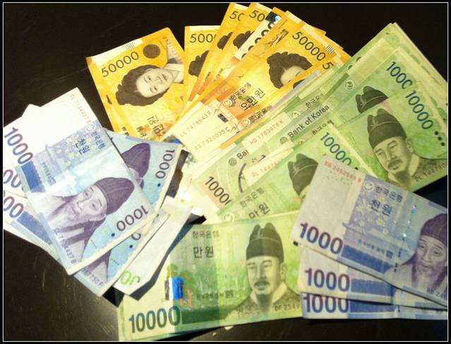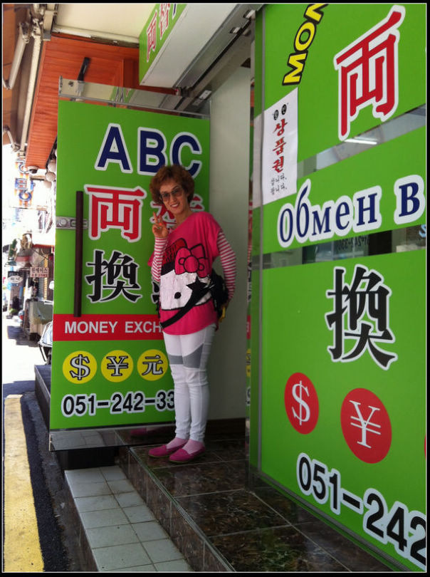 根据釜山地图上的广告,在酒店附近一条小巷子看到一溜排都是兑换店。货比三家,一间店给出的汇率是1:164,确实比仁川机场的1:150高多了,一冲动,啪,5000块全部换掉,到手82万,哇,都可以在南京可以买一套二手房了!