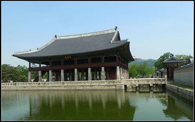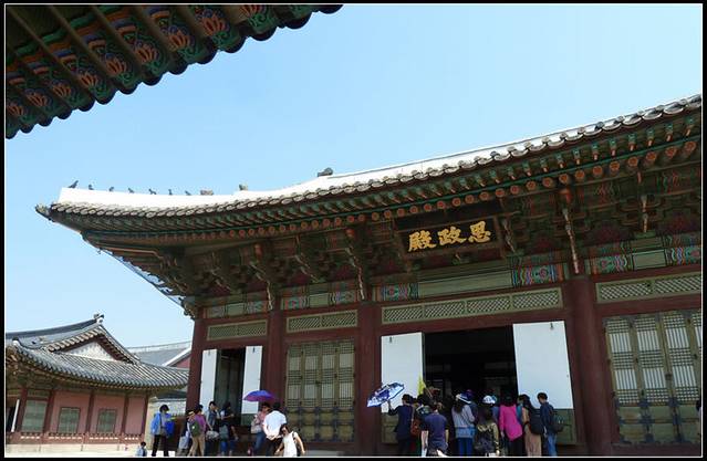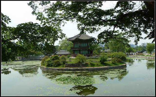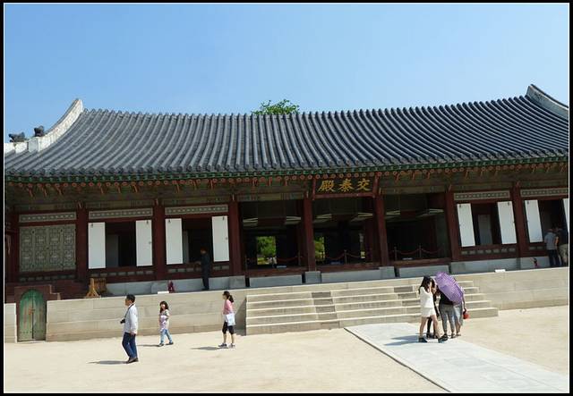 景福宫内有勤政殿、思政殿、康宁殿、交泰殿、慈庆殿、庆会楼、香远亭等殿阁。正殿勤政殿是韩国古代最大的木建筑物,最雄伟壮丽,是举行正式仪式以及接受百官朝会的大殿。思政殿位于勤政殿后边,为国王的办公地点。 我们随便走走,除了慈庆楼,其他建筑都在相机里对号入座了。不过到处是同胞,照片上全都是中国头。