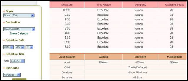 在网站上,选择Origin:Busan〔700〕Destination:Gyeongiu〔815〕;再点选Departure Date输入出发日期,Departure Time选择需要的时间段,显示的页面上,上面一栏有具体出发时间和空余座位数,下面一栏则可以看见票价了。每小时一班,票价根据等级分别为4800和5200韩元。
