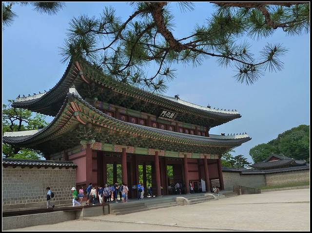 景福宫呈正方形,正门光化门位于景福宫南侧。光化门由三个虹霓门组成,其中位于中间的虹霓门供国王通行,左右两个虹霓门供大臣出入。过光化门,首先看到的就是兴礼门,在景福宫中排名第二,威风凛凛。东面是建春门,西面是迎秋门,北面是神武门。我们不止一次经过光化门,但东面西面的两座门没有看见。