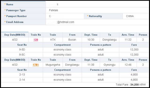但当我在韩国铁路车票预定官网,进入英文界面(只有韩文和英文两个页面),选择Booking菜单里的Booking Online,输入起点釜山和终点庆州后,从跳出的界面来看,只能从Busan(釜山)坐高铁KTX到Dongdaegu(东大邱),然后转无穷花号Mugungwha到Gyeongju(庆州)下车(而不是到Singyeongju(新庆州))。如果衔接得好,约两个多小时。两段的普通坐席票价是12300韩元+4800韩元,总共17100韩元。
